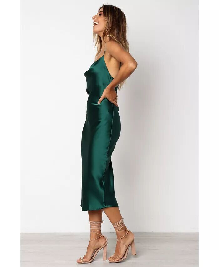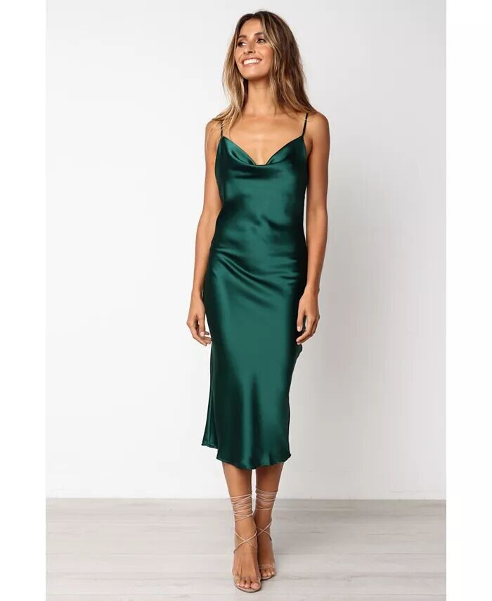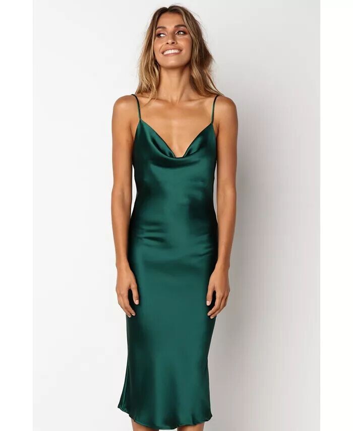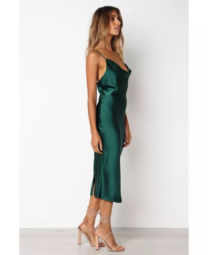 Платье длины миди с воротником-хомутом — идеальное сочетание стиля и изысканности. Тонкие регулируемые бретели обеспечивают идеальную посадку, а разрез на спине придает вашему образу женственности. Шелковистый сатиновый финиш позволит вам сиять всю ночь!