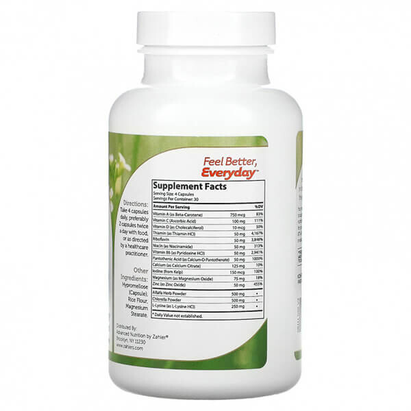 Витамин А (как бета-каротин), витамин С (аскорбиновая кислота), витамин D (как холекальциферол), тиамин (как тиамин гидрохлорид), рибофлавин, ниацин (как ниацинамид), витамин B6 (в виде пиридоксина гидрохлорида), пантотеновая кислота (как кальций-D-пантотенат), кальций (в виде цитрата кальция), йод (из водорослей), магний (в виде оксида магния), цинк (в виде оксида цинка), порошок травы люцерны, порошок хлореллы, L-лизин (как L-лизин гидрохлорид).