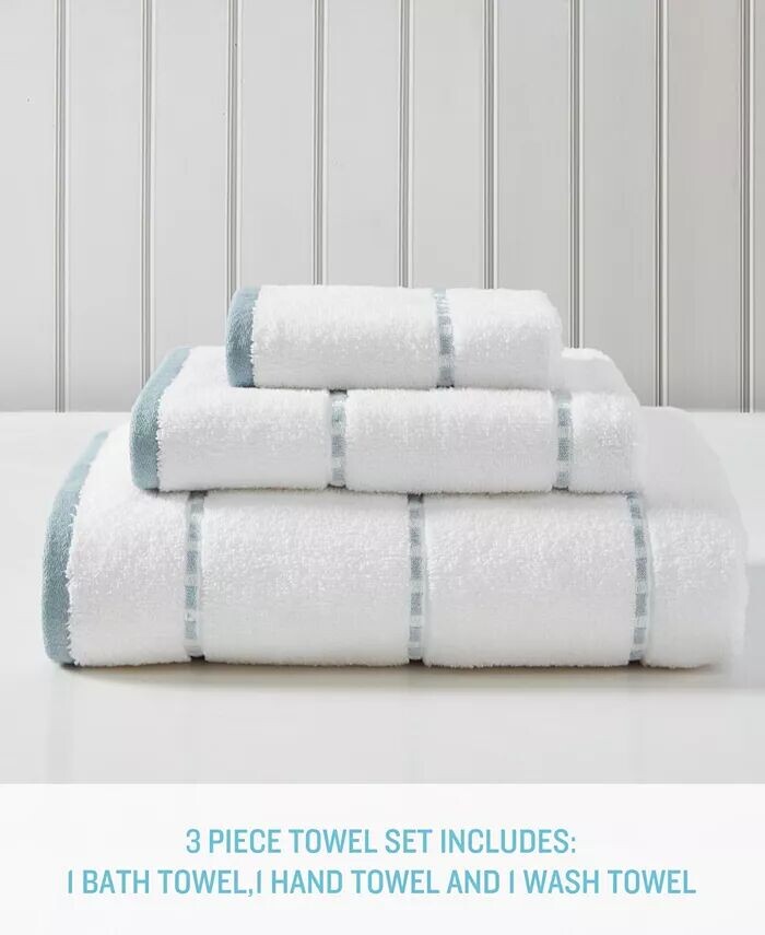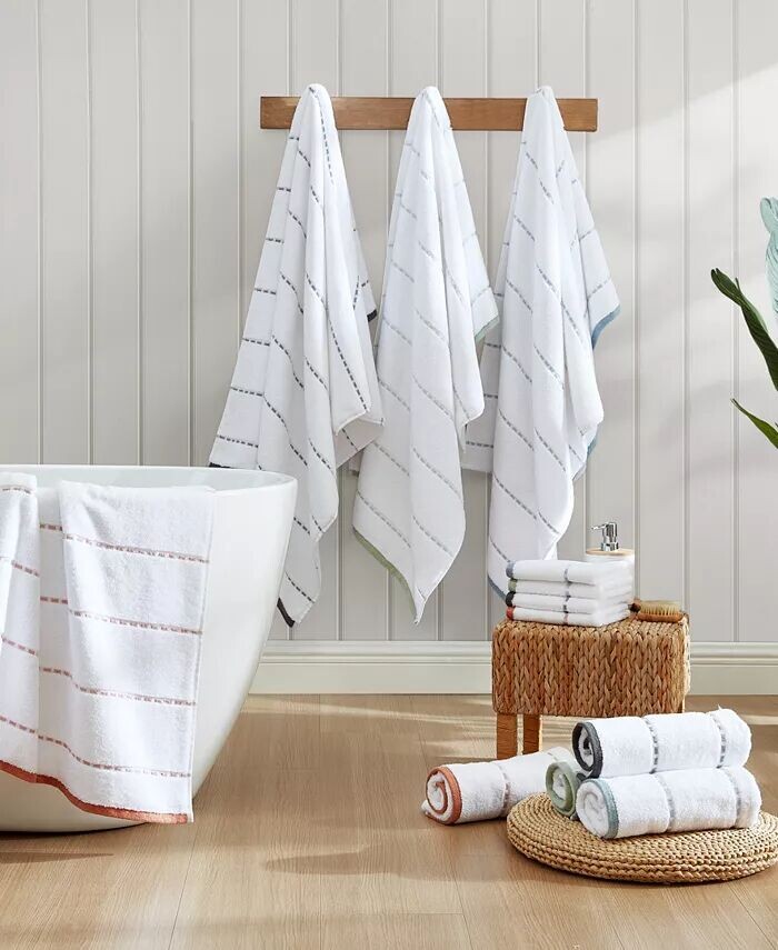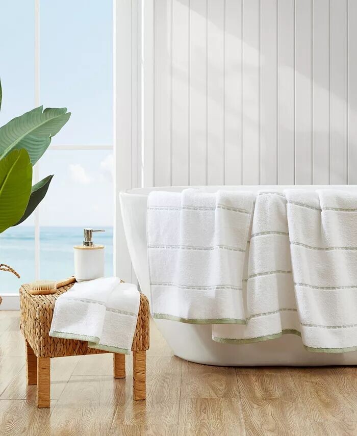В комплект полотенец входит 3 предмета: 1 банное полотенце, 1 полотенце для рук и 1 тряпка для мытья Имеет акцентированную оранжевую, темно-серую, серую или среднюю синюю полоску со складками через полотенце с соответствующим краем на ярко-белом фонеИзготовлено из 100% хлопка — хлопкового волокна премиум-класса. Высокая плотность для максимальной впитывающей способности. Вес: банное полотенце — 600 г/м, полотенце для рук и мытья — 550 гм. Обладает высокой впитывающей способностью, низким ворсом и устойчивостью к выцветанию >Прекрасно сочетается с занавеской для душа и ковриком Tommy Bahama Home — продаются отдельно Хлопок Пригодна для машинной стирки