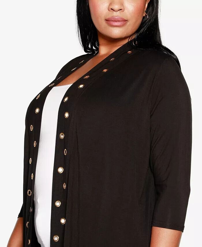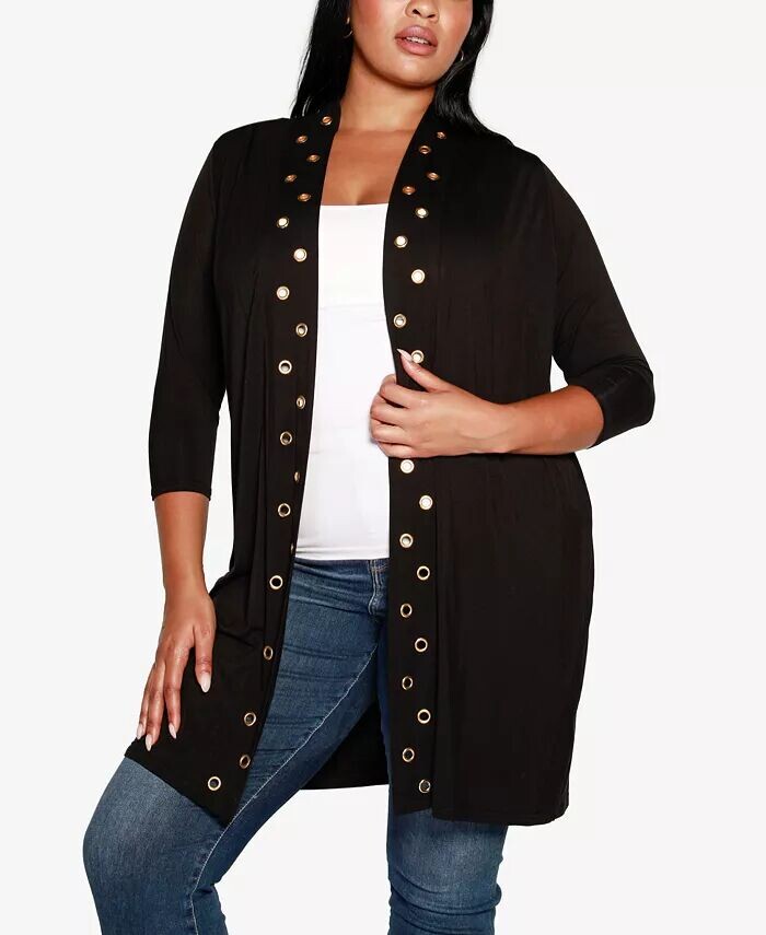Этот кардиган больших размеров с открытой передней частью от Belldini порадует вас. Это изделие длиной в пыльник украшено крупными люверсами для придания дополнительного блеска.