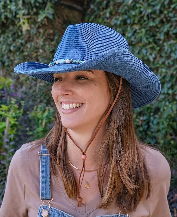 Защита от солнца UPF 50+ Регулируемый ремешок из кожзаменителя Влагоотводящая лента из 100% синего материала Формируемые поля шириной 3¼ дюйма и 8,5 см Декоративная лента для шляпы с бисером Внутренняя регулировка размера Патент США 10 932 512 Ограниченная гарантия 1 год Корпус – бумага, полиэстер, без отделки Точечная чистка