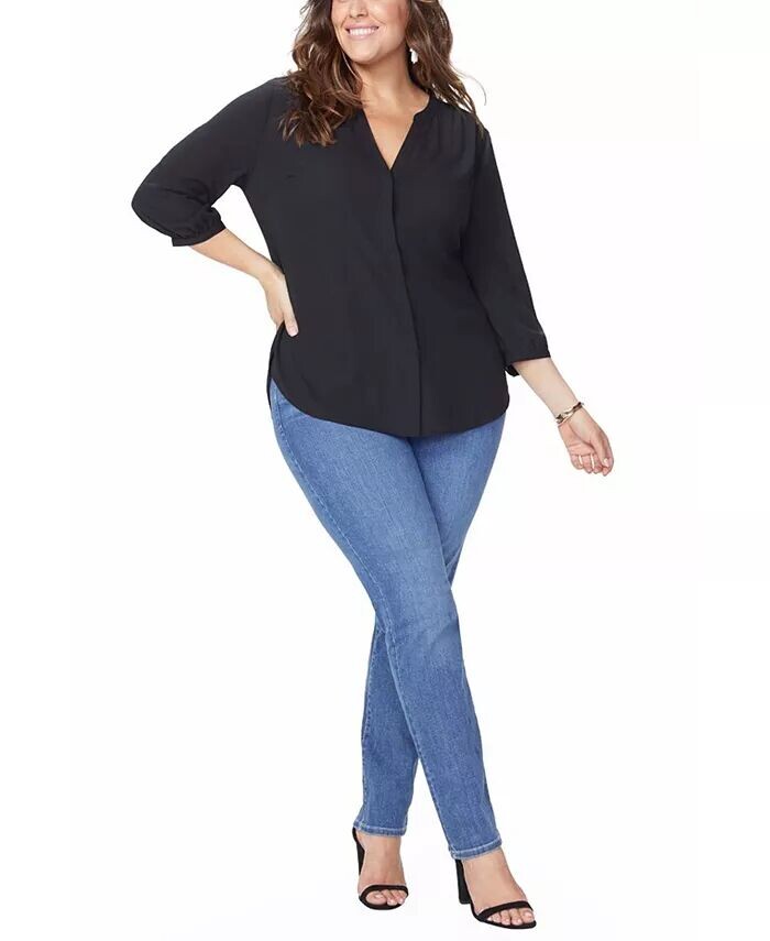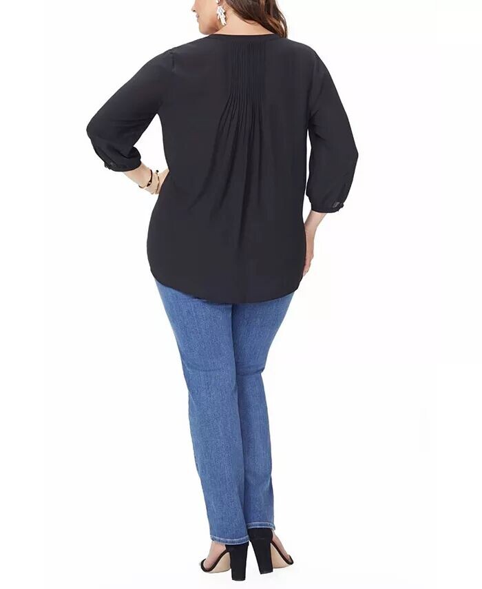 Блузка с защипами от NYDJ размера плюс имеет волнистый силуэт с рукавами три четверти, который идеально сочетается с любыми моделями утягивающих джинсов. Складка на кокетке сзади создает изысканную, но легкую драпировку.