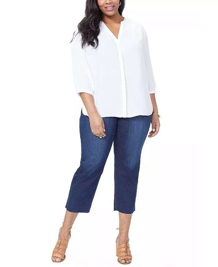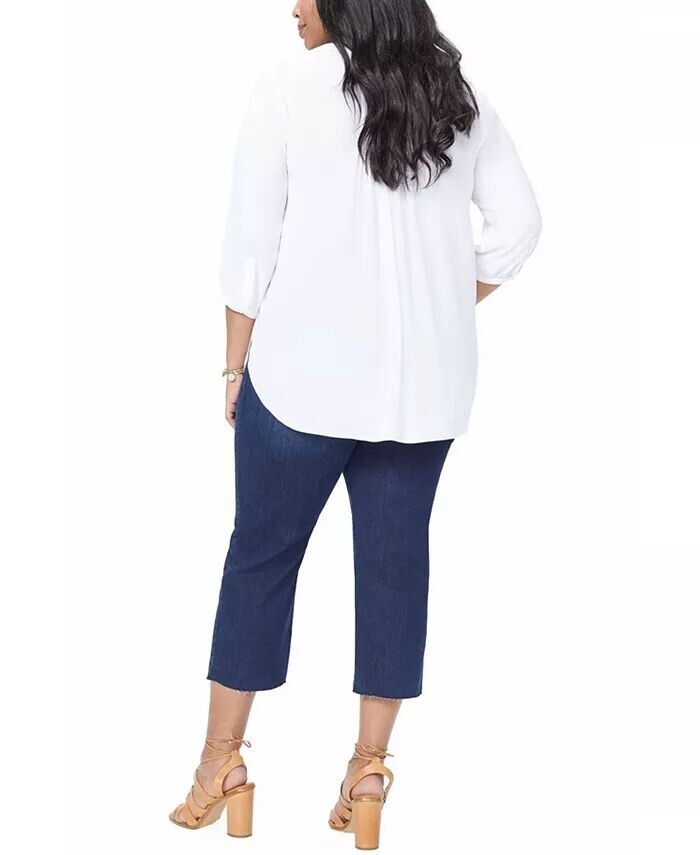 Блузка с защипами от NYDJ размера плюс имеет волнистый силуэт с рукавами три четверти, который идеально сочетается с любыми моделями утягивающих джинсов. Складка на кокетке сзади создает изысканную, но легкую драпировку.