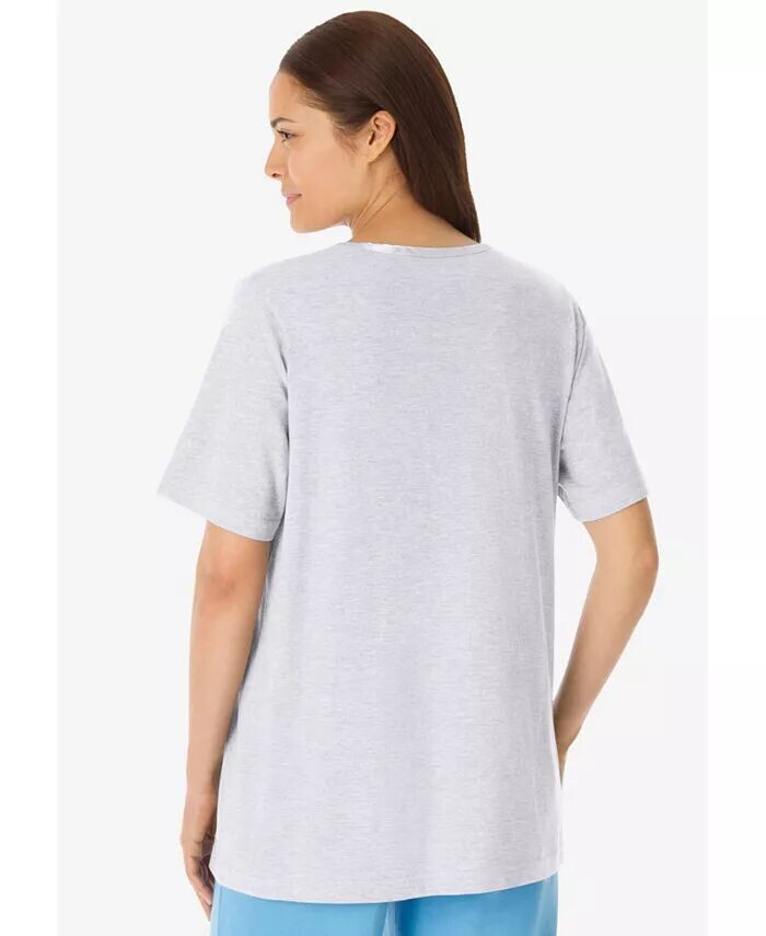 Наслаждайтесь этой сверхмягкой футболкой для сна с атласной отделкой, окрашенной в тон, и розеткой. А-силуэт. Без тегов комфорт. Боковые разрезы на длине 28 см. Серый вереск из чистого хлопка – это хлопок/политрикотаж. Машинная стирка, импортная.