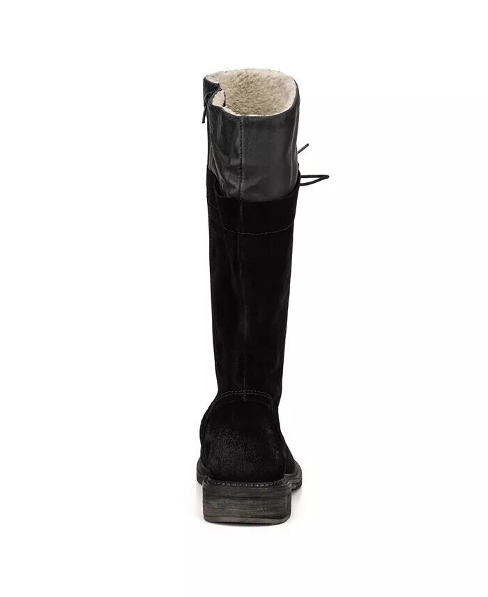 Верх из мягкой замши доходит до середины икры и имеет шнуровку сверху вниз для надежной посадки. Фирменная отделка на союзке и уютная внутренняя подкладка из шерпы с возможностью отгиба. Закругленный носок и короткий каблук.