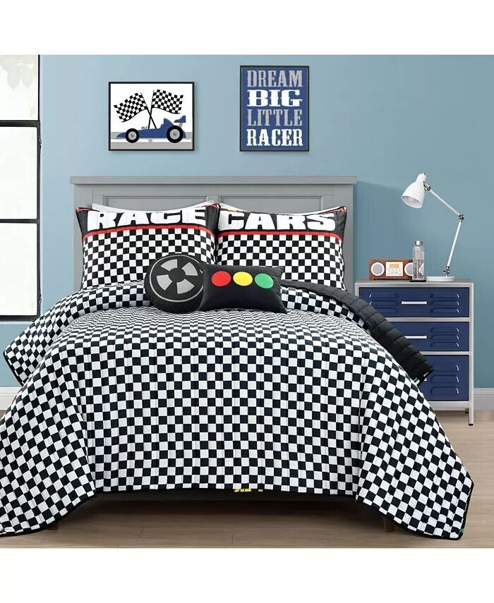 Если ваш ребенок любит смотреть быстрые машины и играть в видеоигры с автогонками, этот комплект одеял идеально подойдет для его первой большой детской спальни. На лицевой стороне изображены разноцветные автомобили, пересекающие финишную черту, а на реверсе — принт на клетчатом флаге.