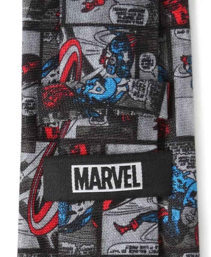Это возвращение ко временам чтения комиксов. На этом сером галстуке изображены классические изображения из комиксов о Капитане Америке. Цвета Капитана Америки выделяются на галстуке и привлекают внимание. Украсьте свой наряд первым Мстителем.
