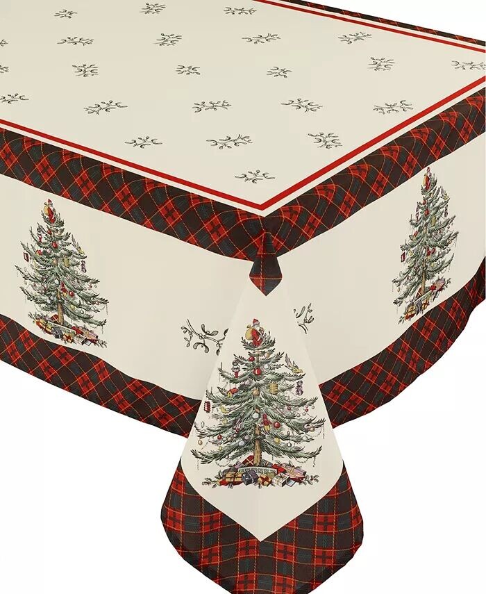 Продолговатая скатерть Spode Christmas Tree в клетку тартан — это новый взгляд на старую классику, с зелено-красной клетчатой ​​клеткой, которая придает ей свежий, новый вид с рождественскими елками вокруг низа скатерти и обрамленной сверху и снизу клетчатой ​​клеткой. и падуб и ягоды наполняют верх.