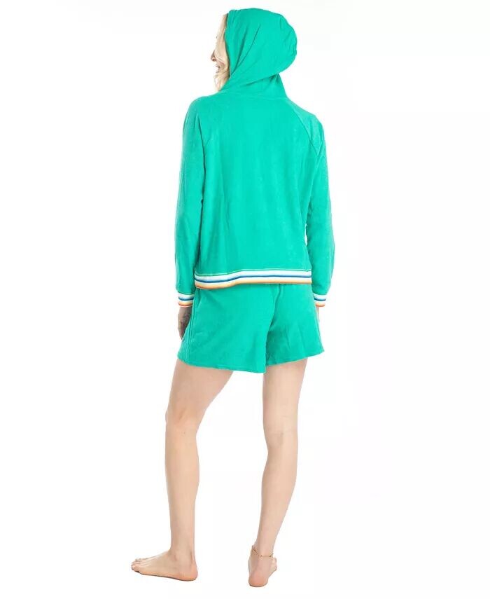 Очаровательный комплект махровых шорт, состоящий из топа с длинными рукавами и капюшоном и непринужденных и удобных шорт для отдыха в стиле одежды для серфинга.