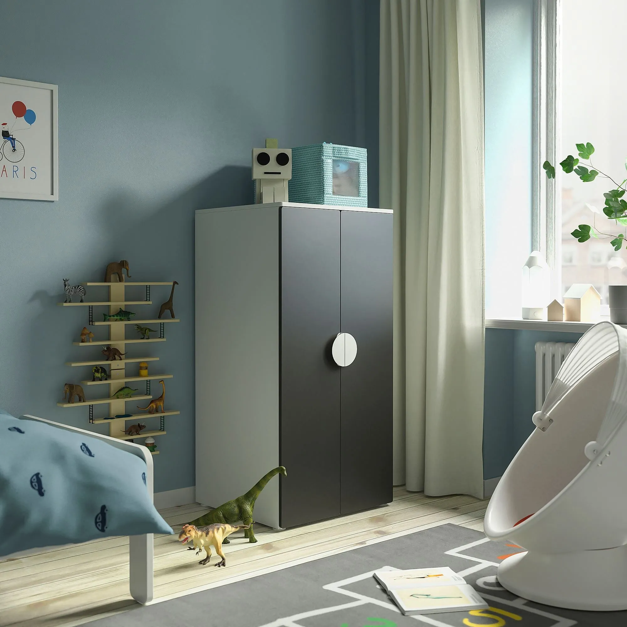 Этот гардероб адаптирован к росту и моторике ребенка младшего возраста, чтобы он мог самостоятельно дотянуться и повесить одежду.