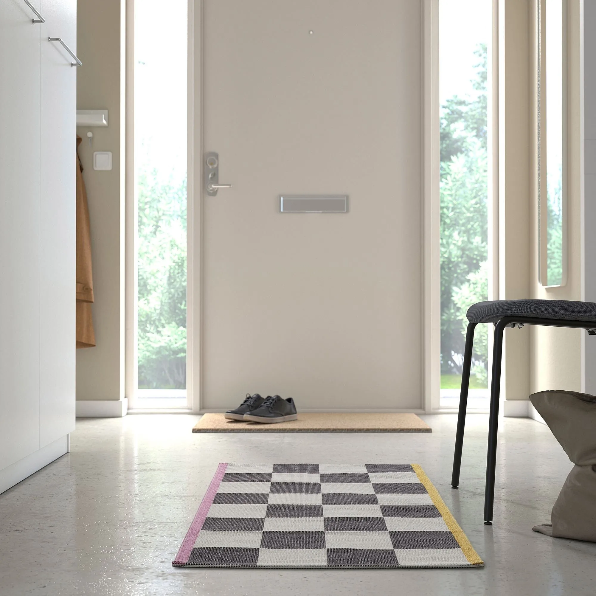 Ковер KLASSRUM с шахматным узором и контрастными цветами по бокам, добавляющий свежий оттенок ретро-атмосфере. Плоское плетение позволяет легко разместить ковер – в центре комнаты или возле кровати.