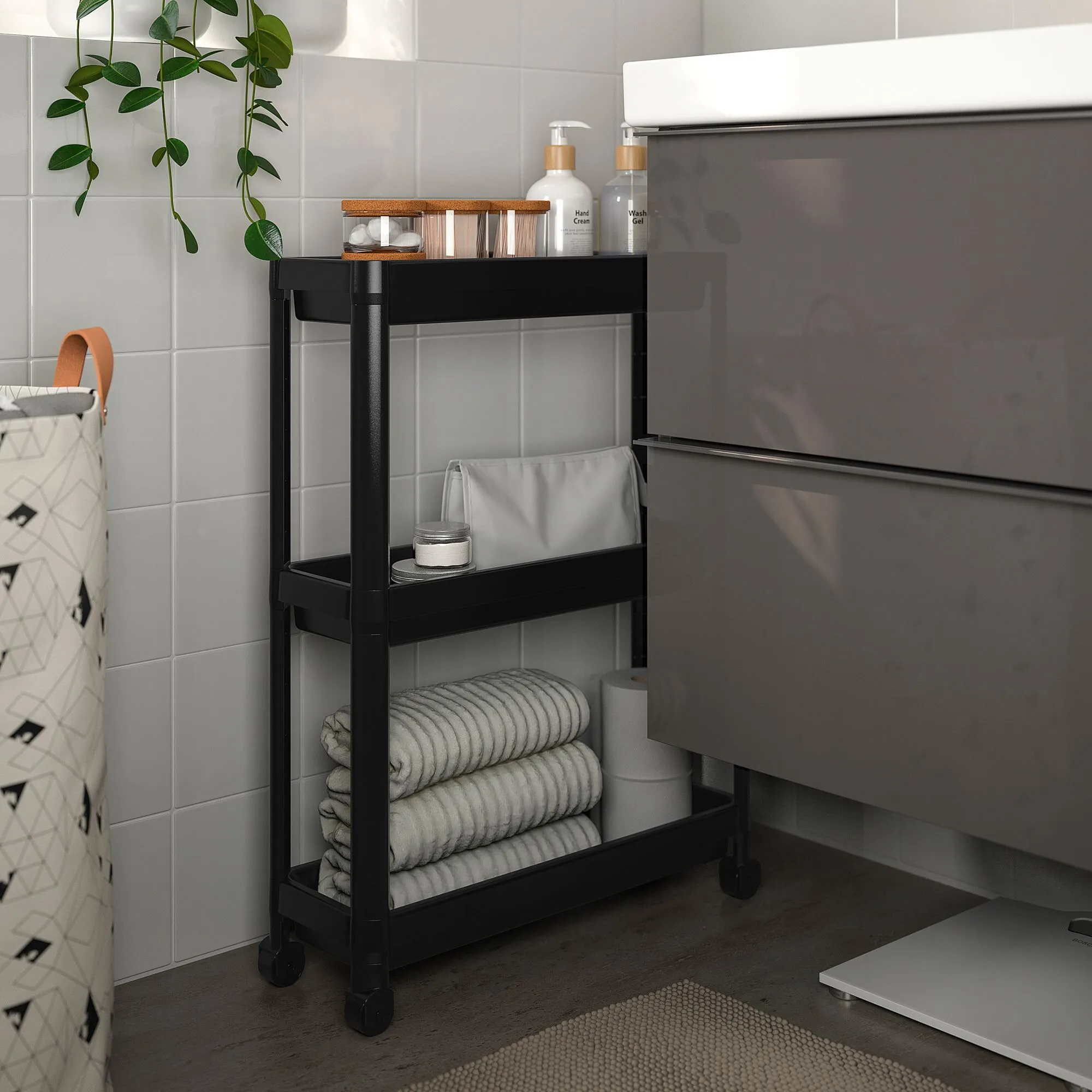 Прочная конструкция и четыре ролика облегчают перемещение тележки и ее использование. где угодно. Благодаря небольшому размеру он помещается даже в ограниченном пространстве.