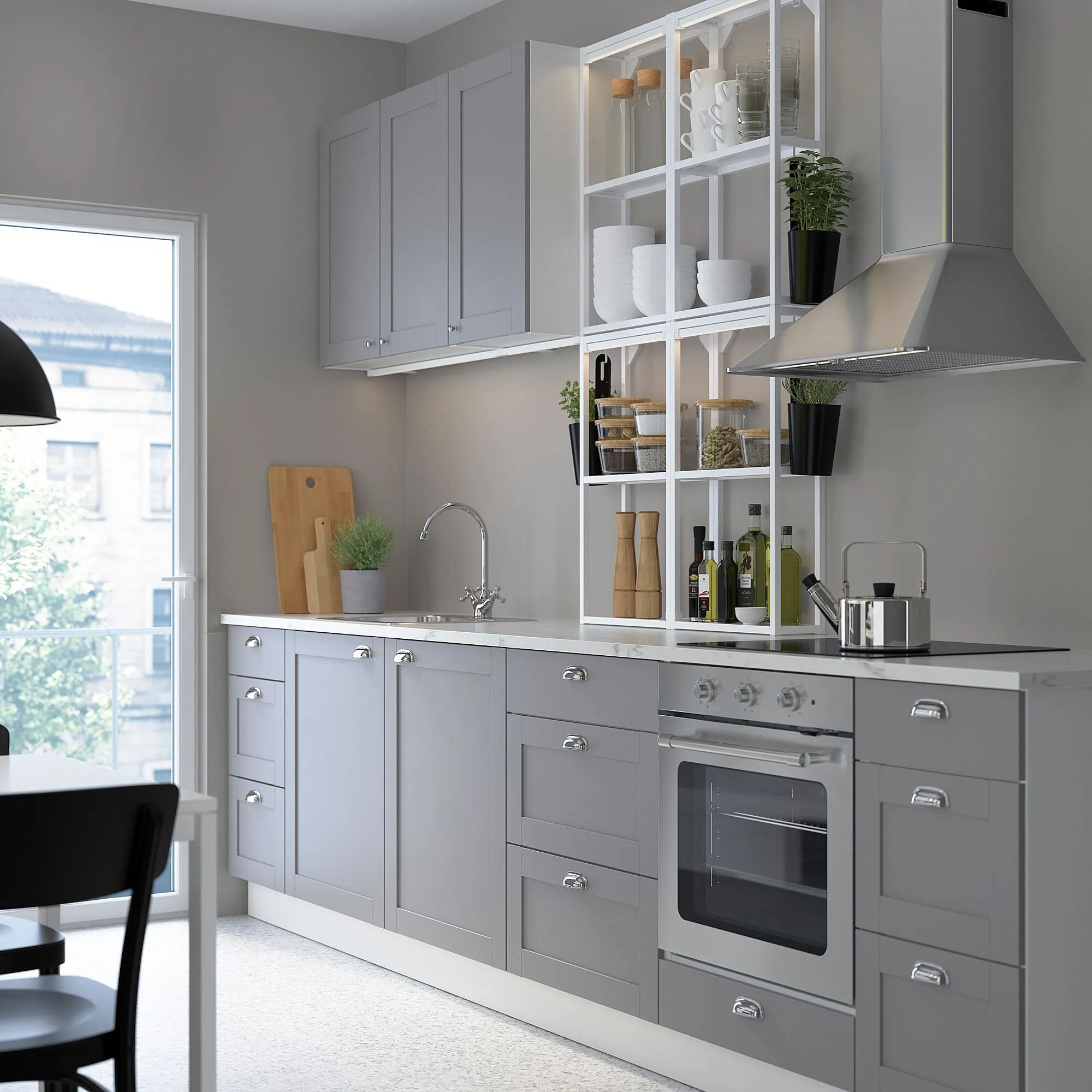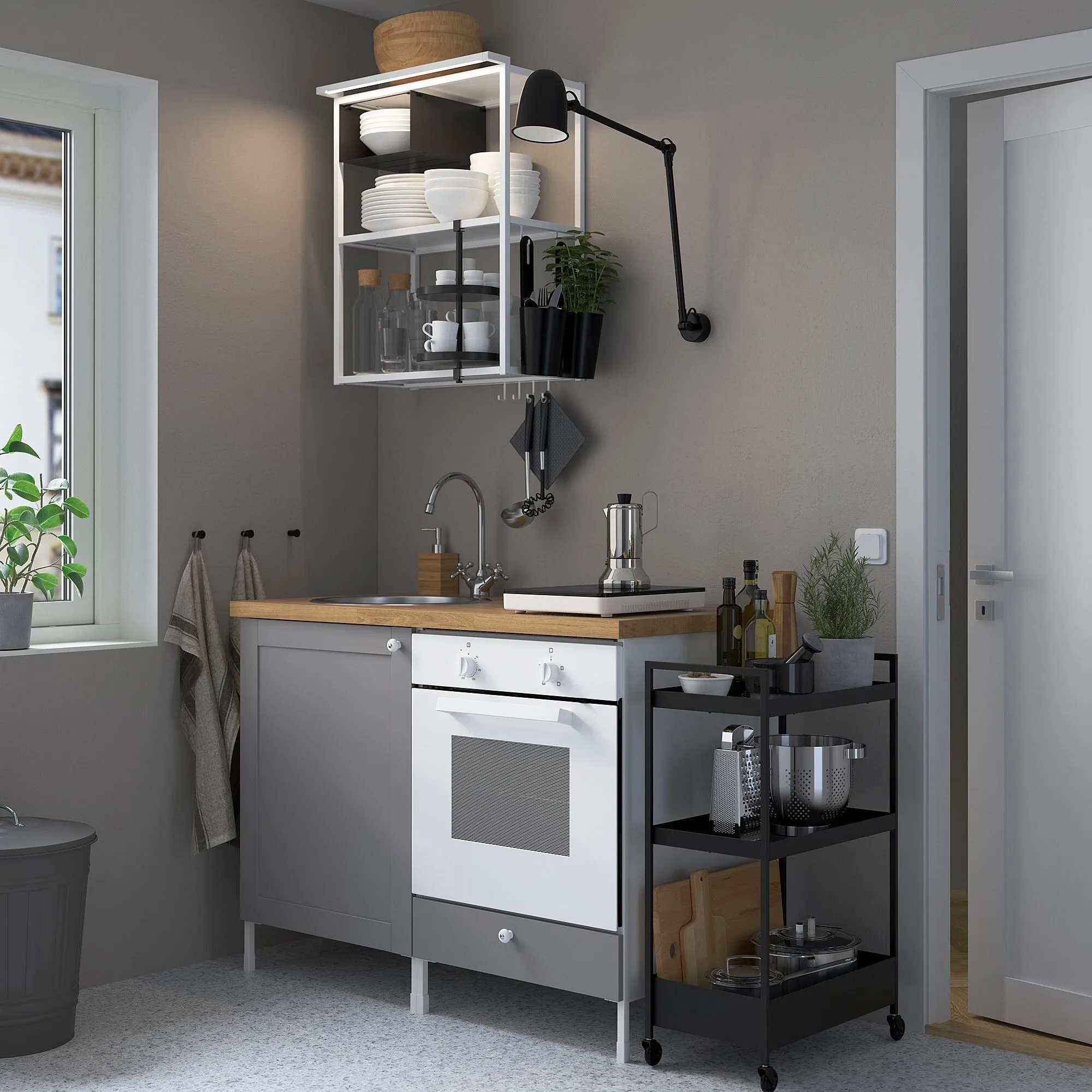 Вы можете использовать осветительную ленту под навесными шкафами ENHET и открытыми настенными рамами в качестве рабочего освещения – или использовать ее для создания уютного света внутри открытые стены.