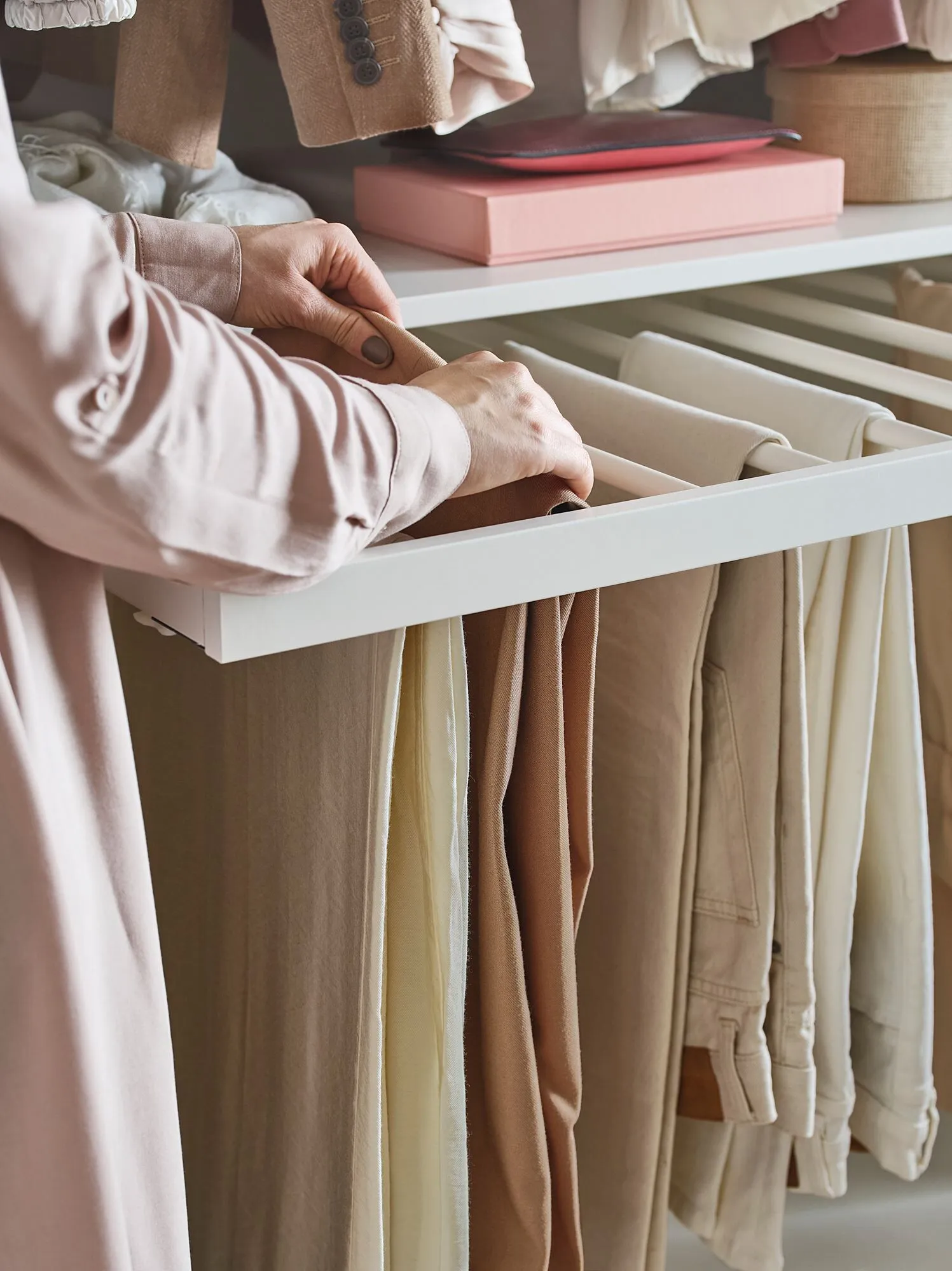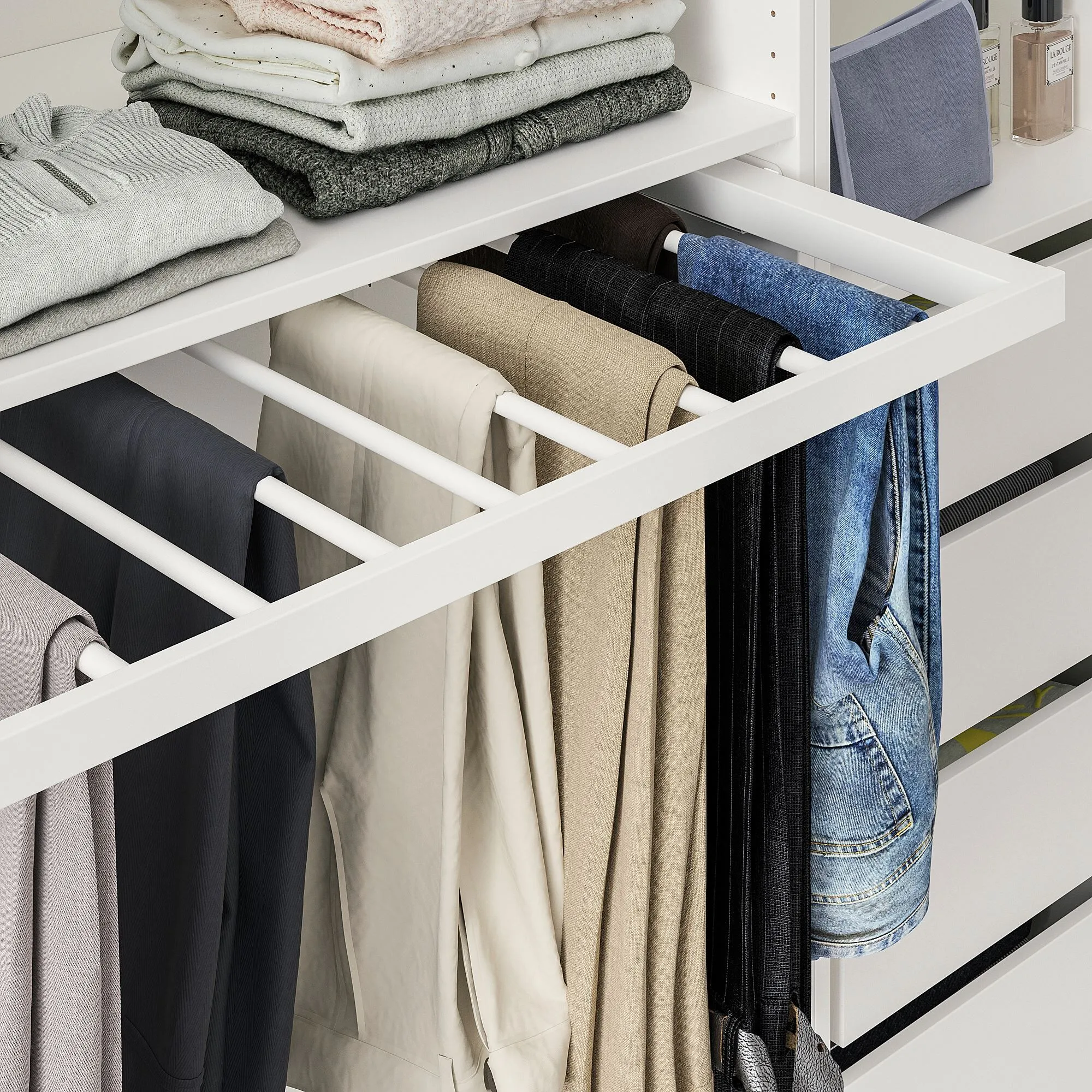 Вы можете легко увидеть и достать свои брюки, поскольку вешалка для брюк выдвигается.