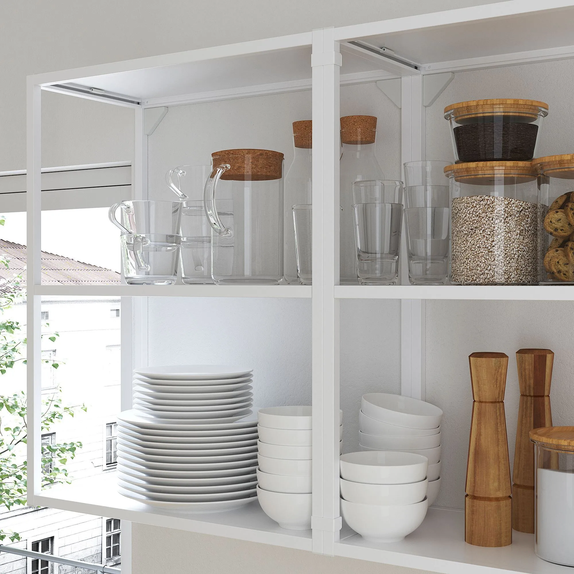 Почему бы не выбрать идеальное сочетание открытого и закрытого типа хранилище? Поместите часто используемые предметы в открытые рамы ENHET, а вещи, которые часто загромождаются, спрячьте в закрытые шкафы ENHET.