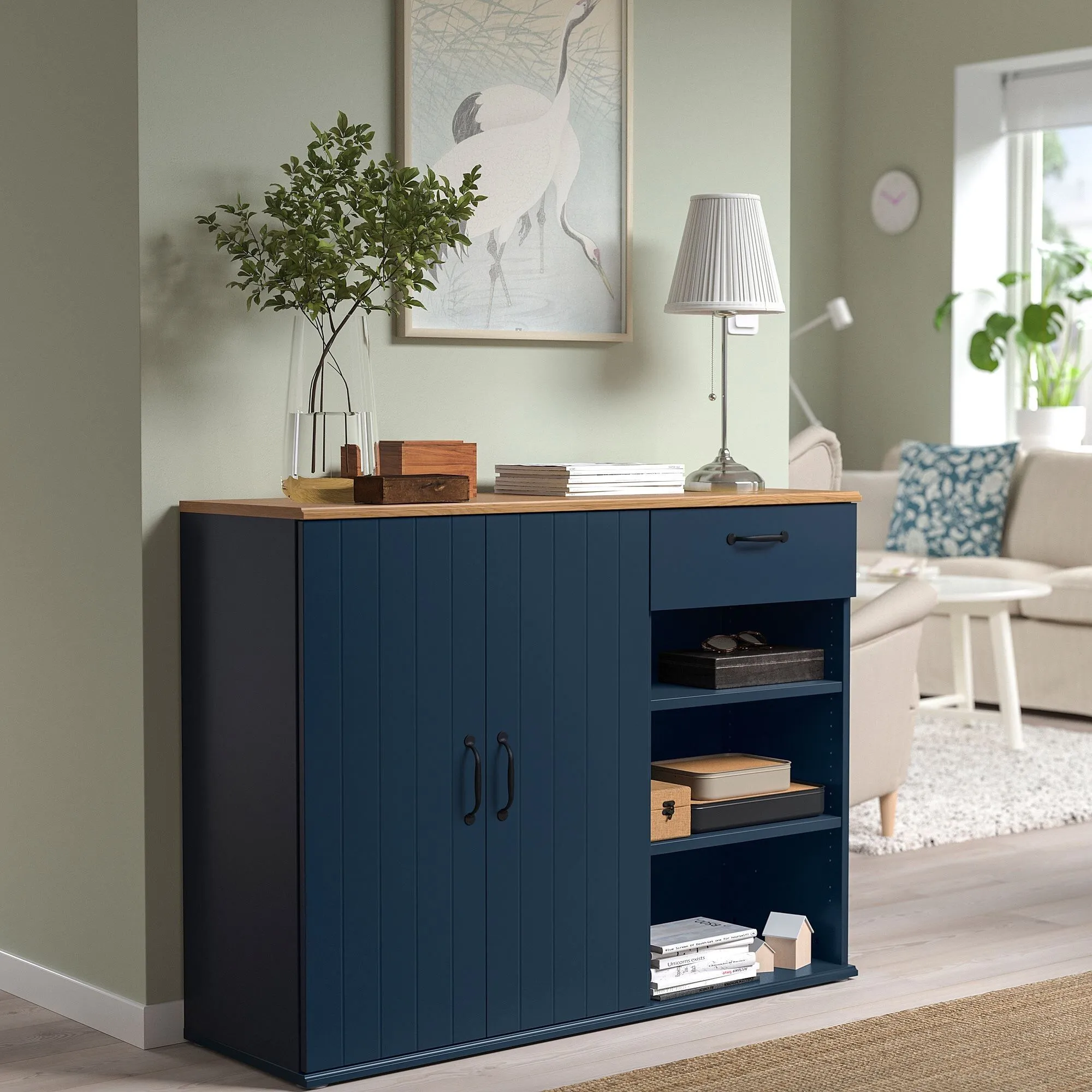 Разместите свои любимые предметы на витрине поверх буфета и спрячьте предметы, которые имеют тенденцию загромождать пространство, в ящике или за дверью.