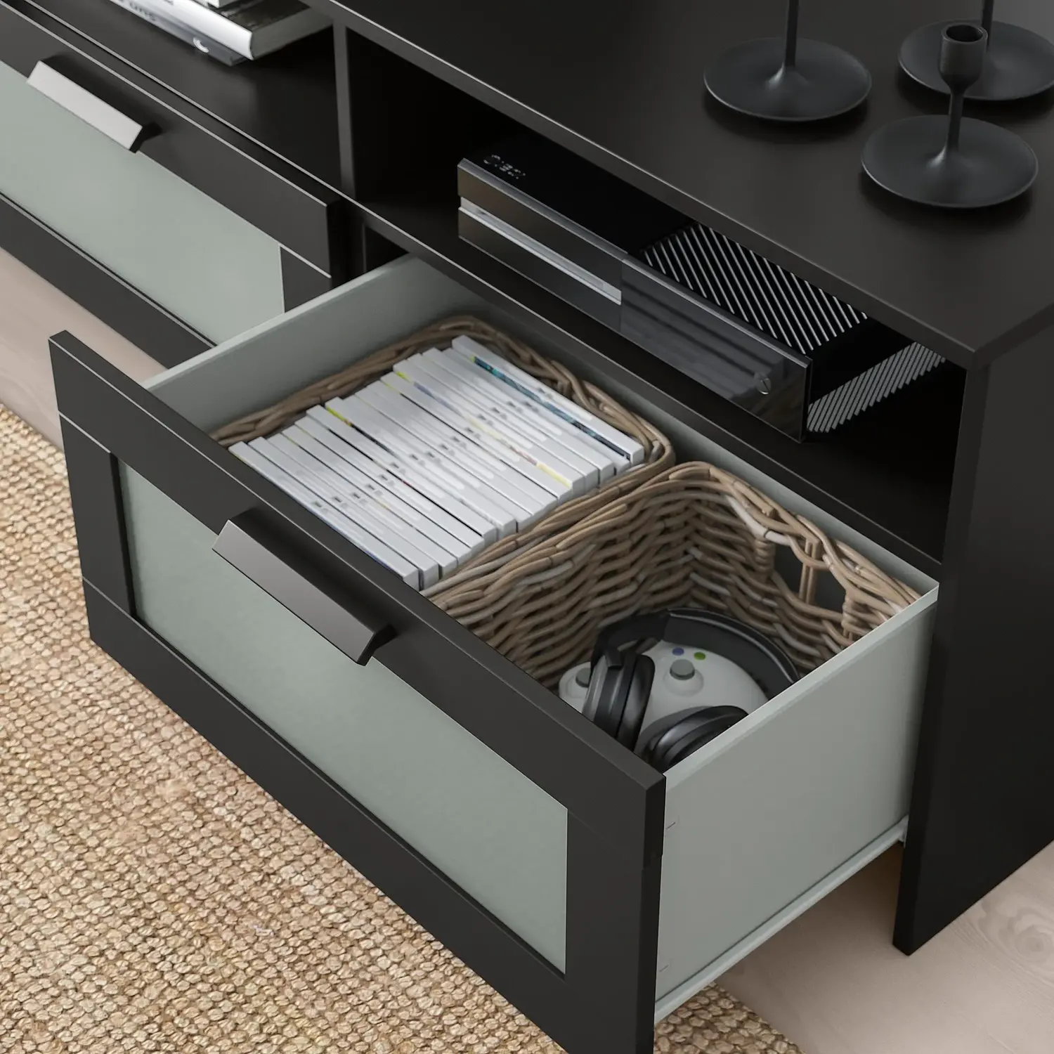 Эта тумба под телевизор оснащена большими ящиками, которые позволяют легко хранить в порядке пульты дистанционного управления, игровые контроллеры и другие аксессуары для телевизора.