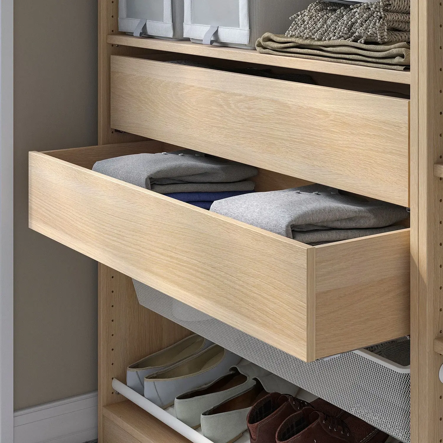 Если у вас есть открытый гардероб ПАКС, вы можете добавить дополнительный индивидуальный подход, объединив этот ящик с любыми ручками или ручками по вашему выбору.