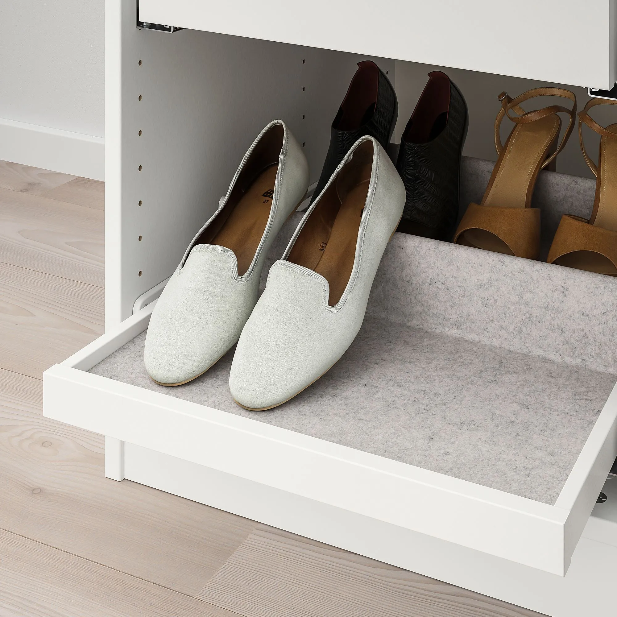 Хорошее решение для хранения легкой одежды, например футболок. Комбинируйте с ковриком для ящика КОМПЛИМЕНТ, чтобы получить фетровую поверхность, которая не позволит вещам скользить.