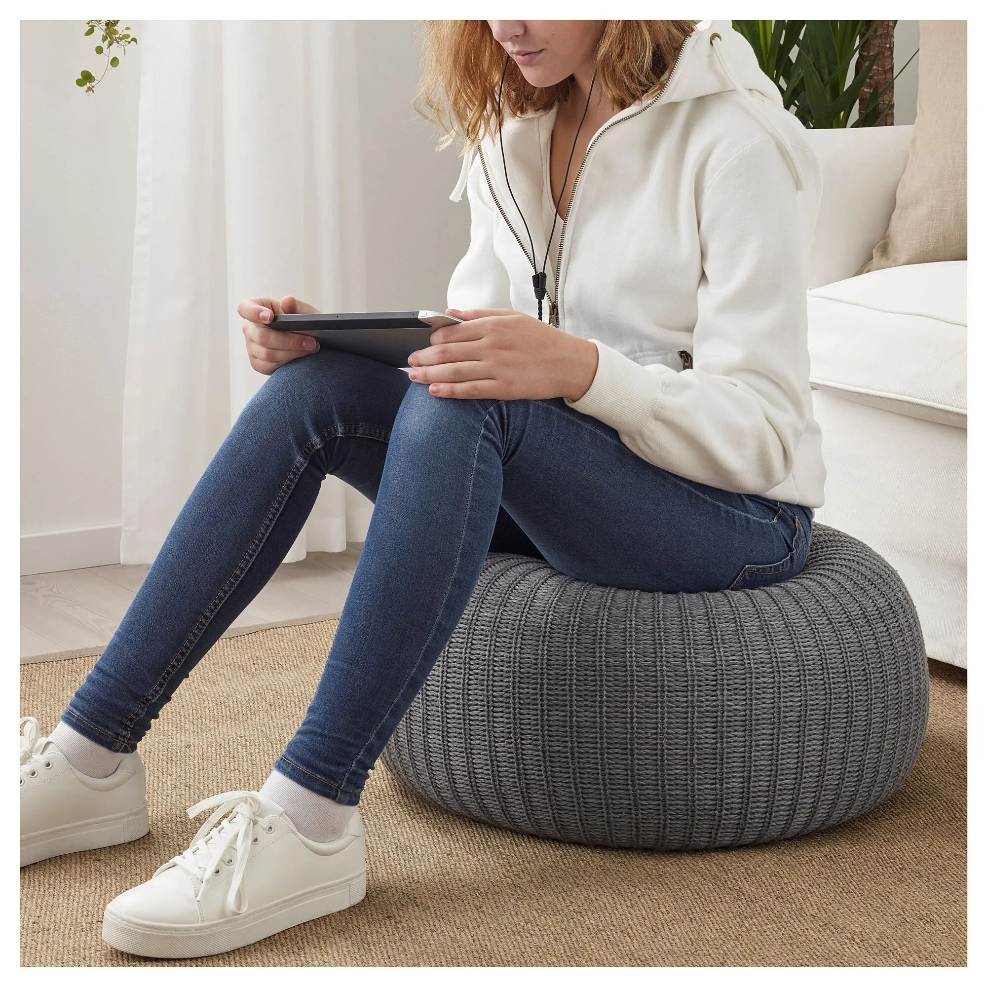 Пуфы SANDARED доступны в трех размерах. У них мягкие вязаные чехлы разных цветов и узоров. Используйте их по отдельности или вместе в индивидуальной комбинации.
