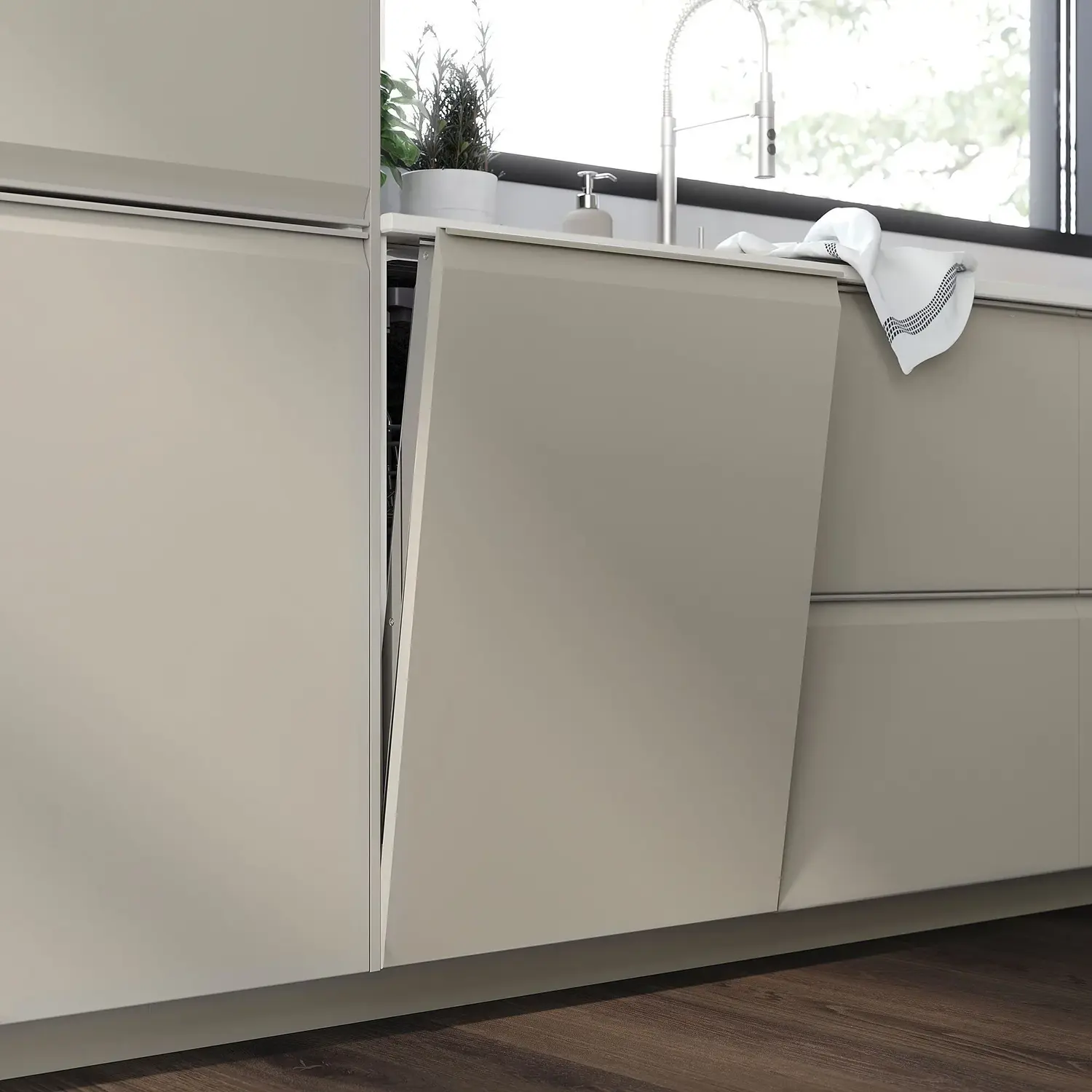 Встроенная алюминиевая ручка бежевого цвета гармонирует с фасадом и Создайте современный и графический вид. Она также обеспечивает устойчивость и имеет удобный и естественный захват.