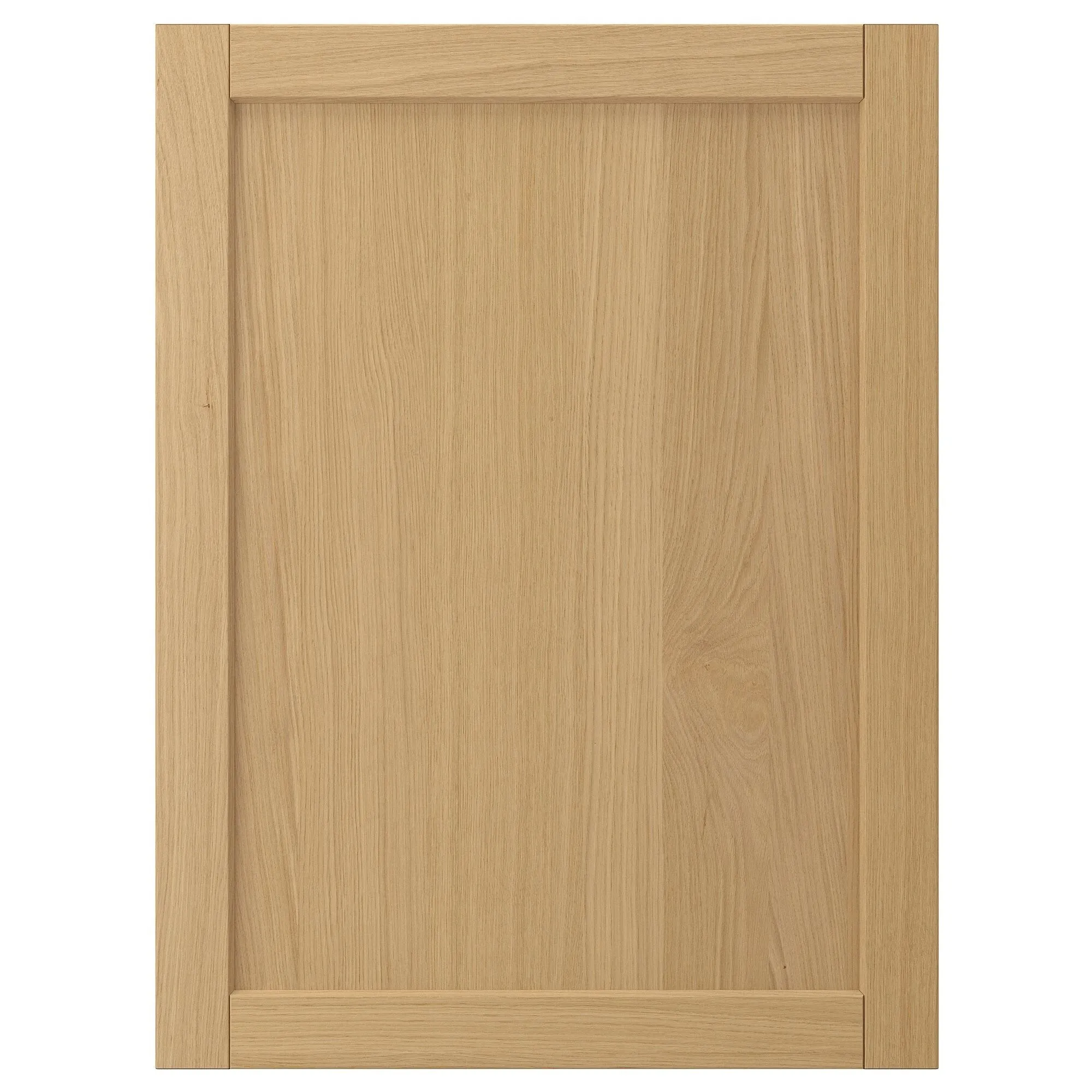 Кухонные фасады FORSBACKA из теплого дубового шпона приветствуют вас и заставляют чувствовать себя как дома. Дверь в рамке со скошенными краями создает классический, традиционный характер.