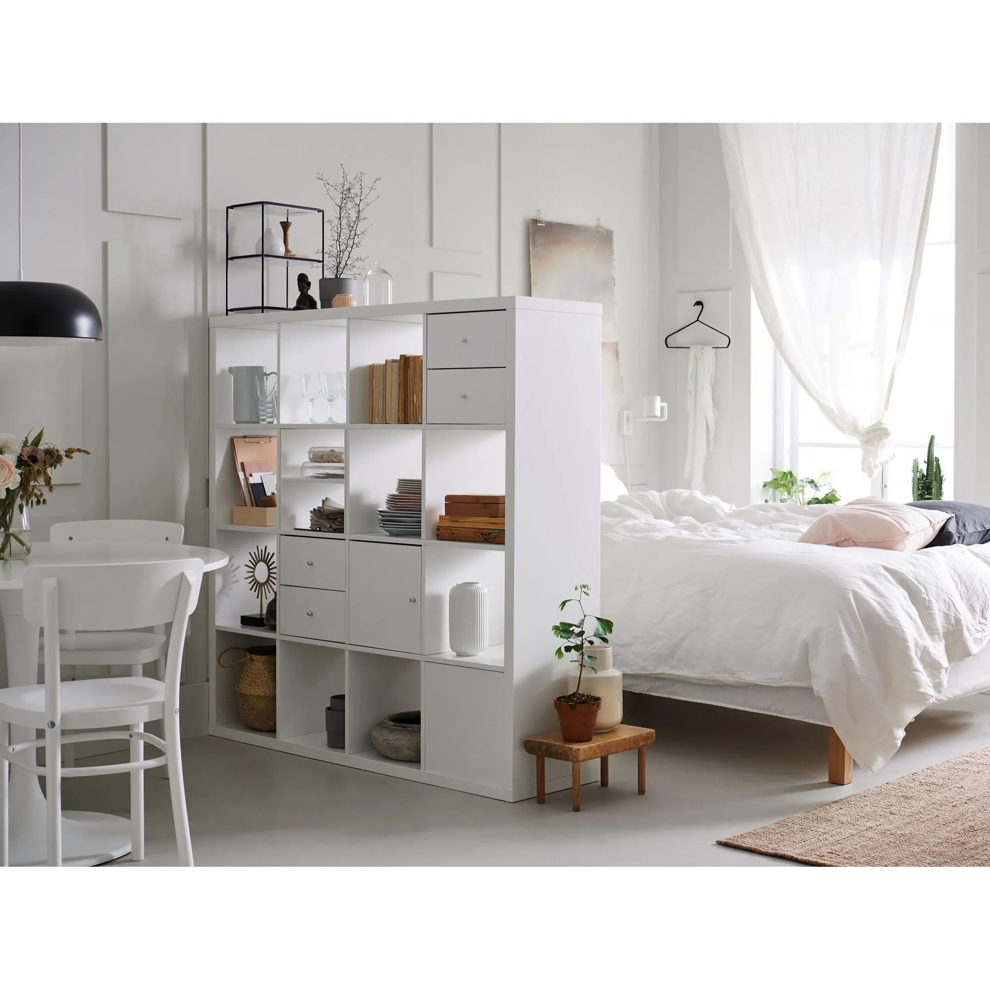 Вы можете использовать этот стеллаж в качестве перегородки, чтобы создать комнату внутри комнаты, сохранив при этом много места для хранения вещей.