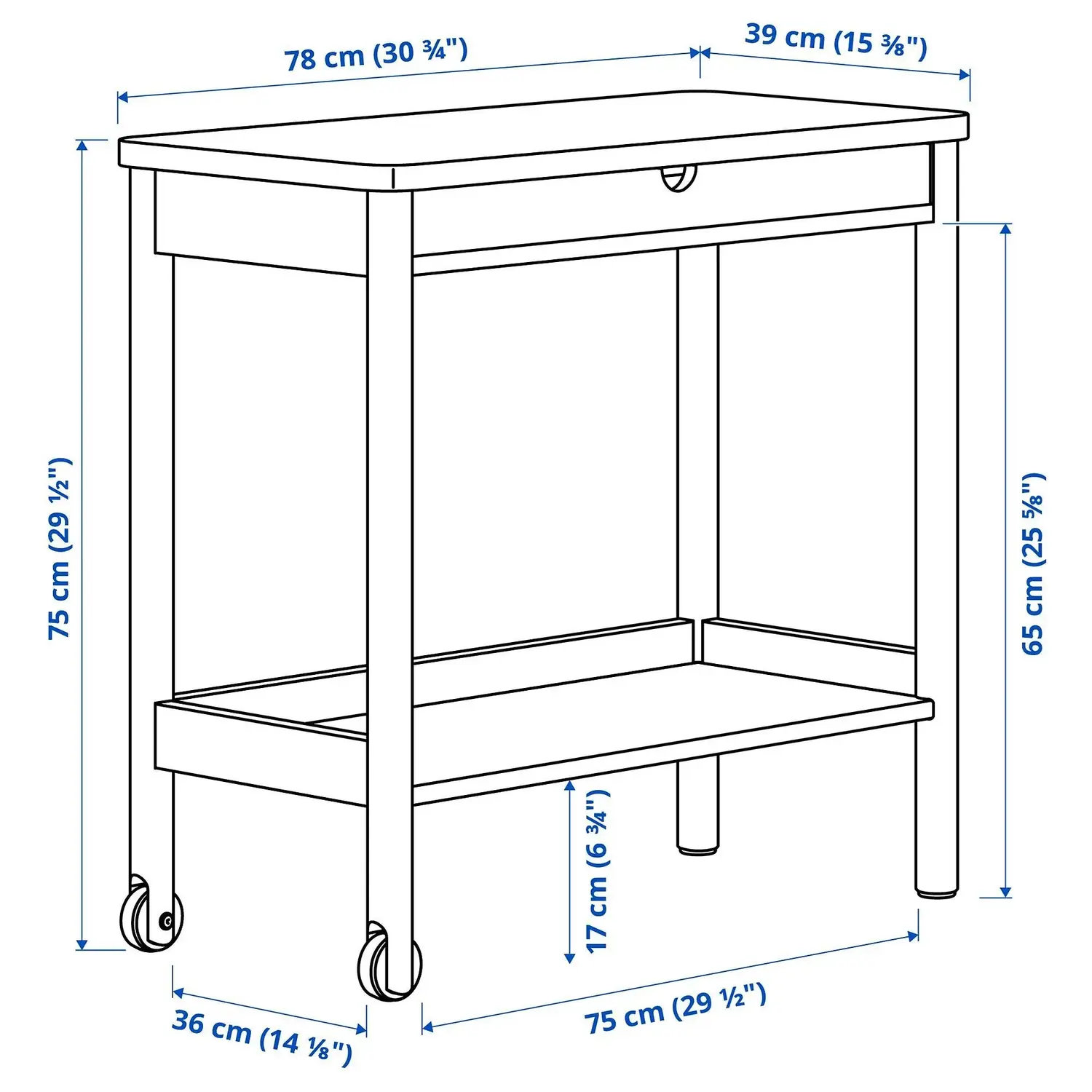Длина тележки (78 см) хорошо сочетается с шириной раздвижного стола РЁННИНГЕ (118/173x78 см). Сложите их вместе, чтобы получить удлиненную столешницу и удобное дополнительное место для хранения вещей в обеденной зоне.