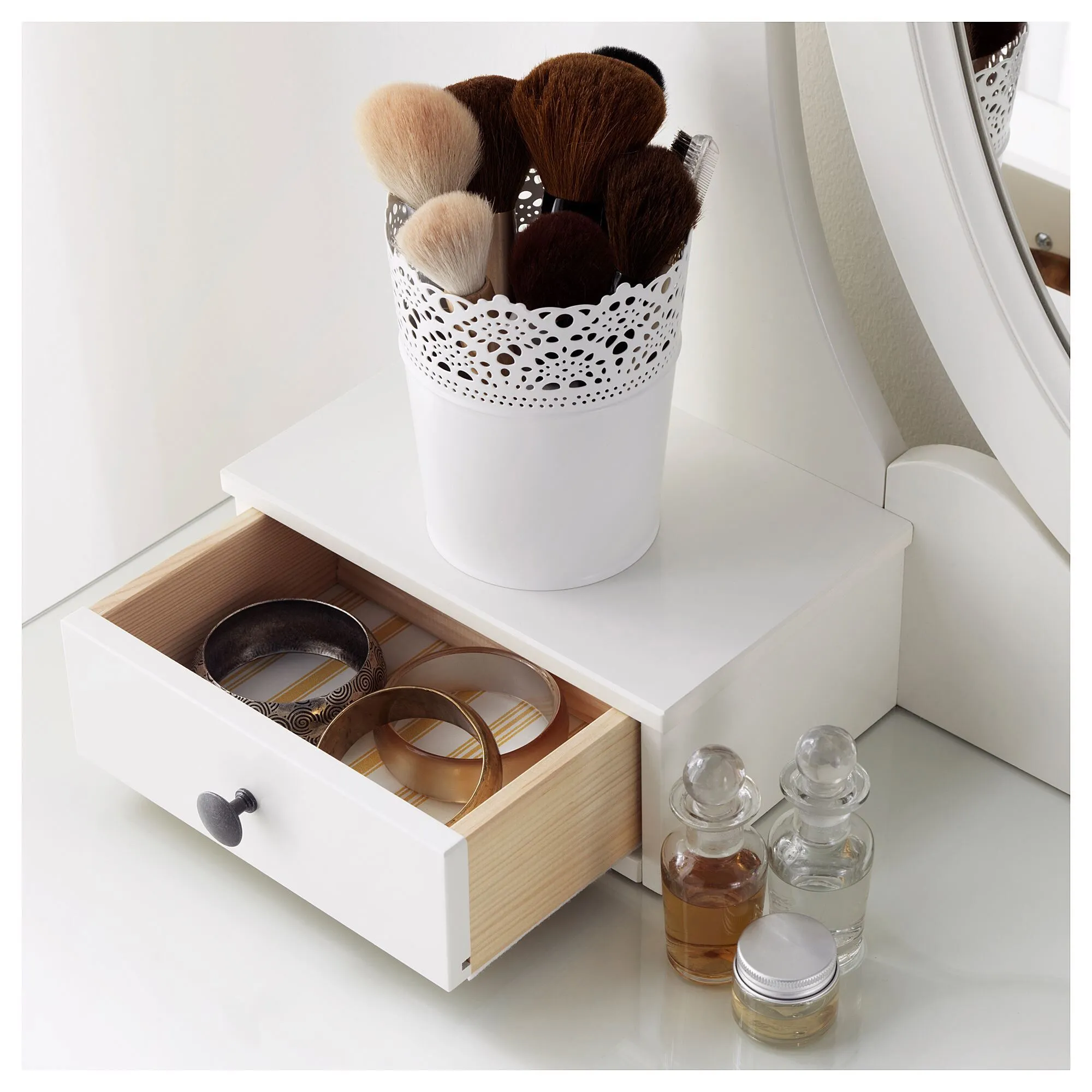 В двух маленьких ящиках и в большом ящике, спрятанном под туалетным столиком, достаточно места для косметики и украшений.
