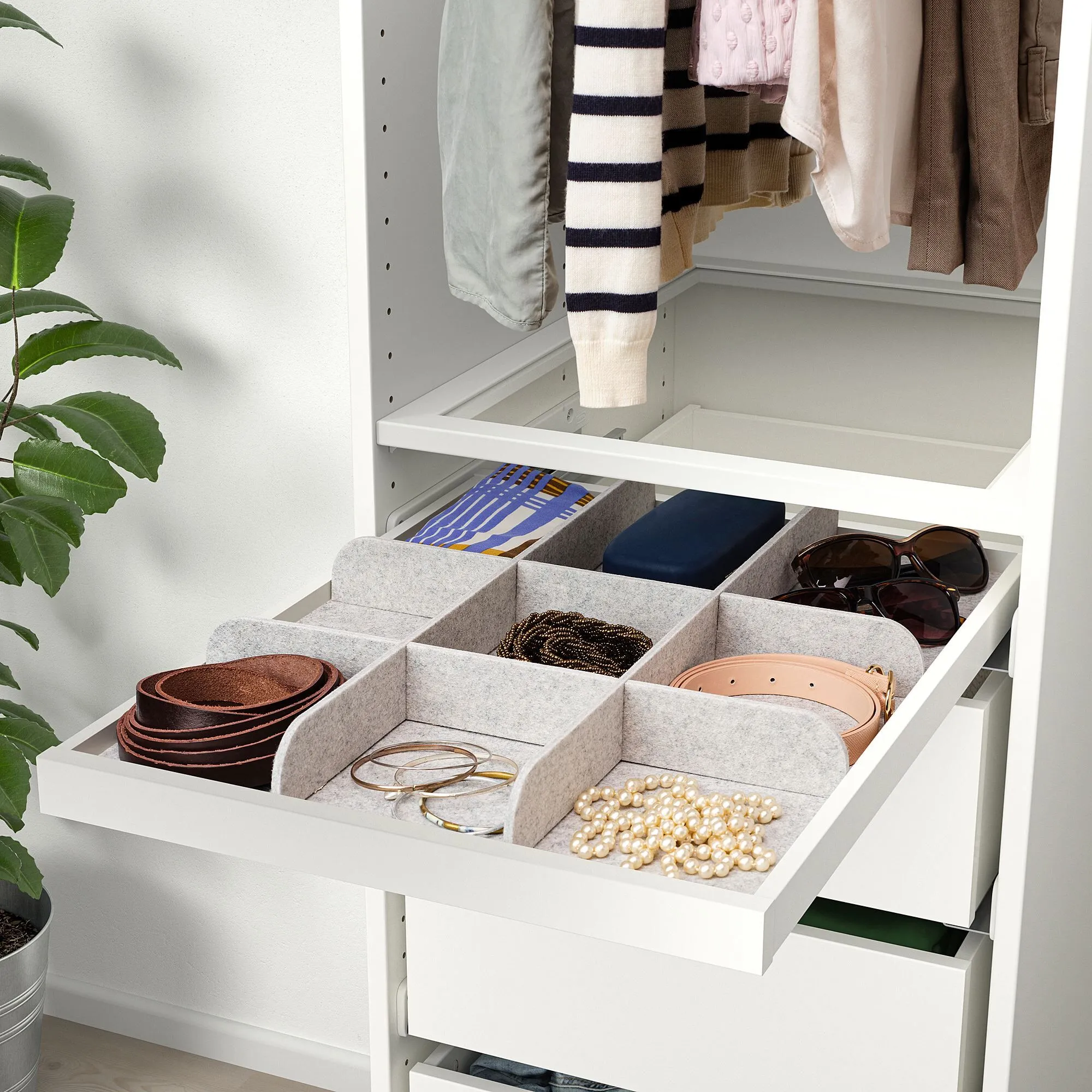 Перегородка помогает хранить мелкие вещи, такие как шарфы, ремни и галстуки, в порядке и их легко найти.