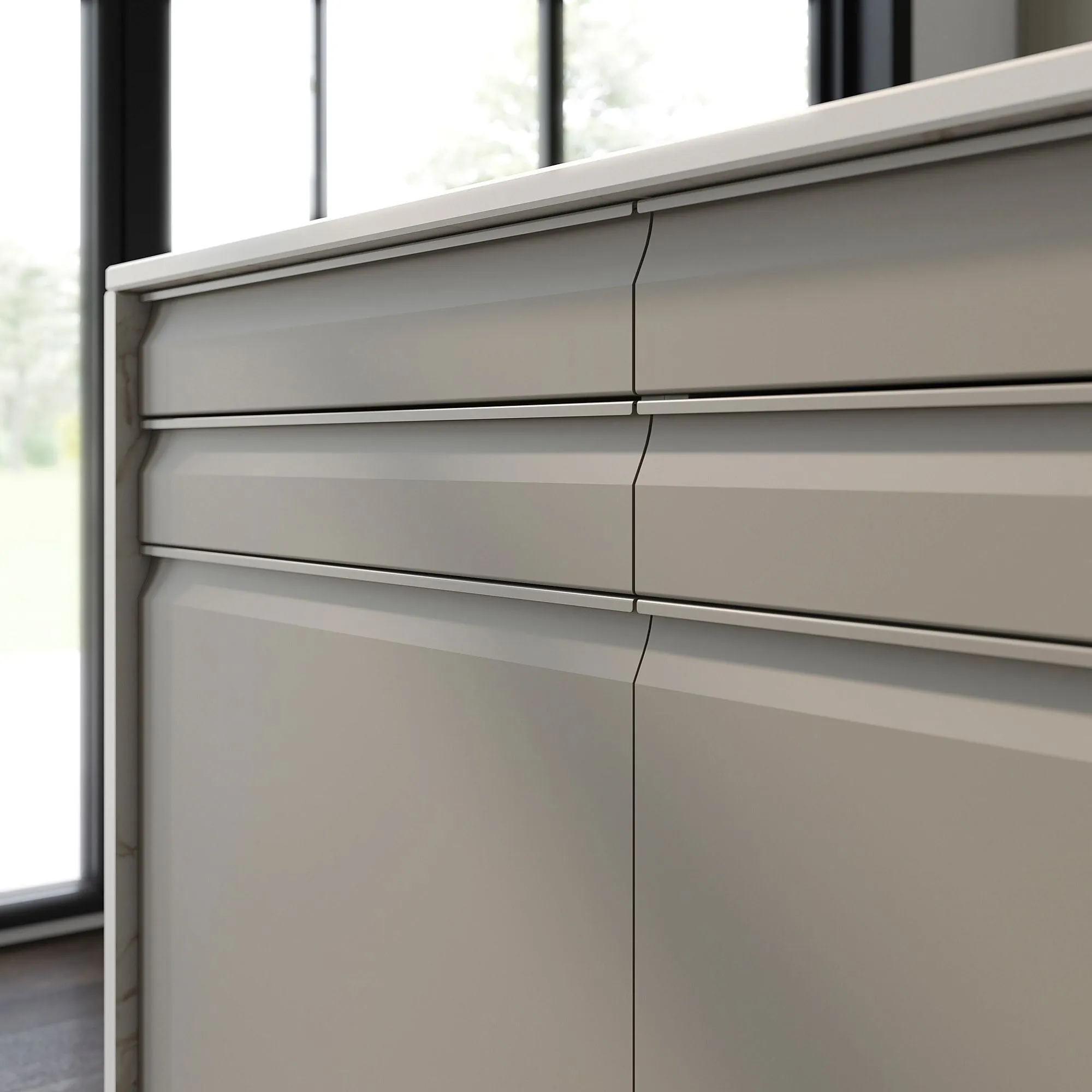 Встроенная алюминиевая ручка бежевого цвета гармонирует с фасадом и Создайте современный и графический вид. Он также обеспечивает устойчивость и удобный, естественный захват.