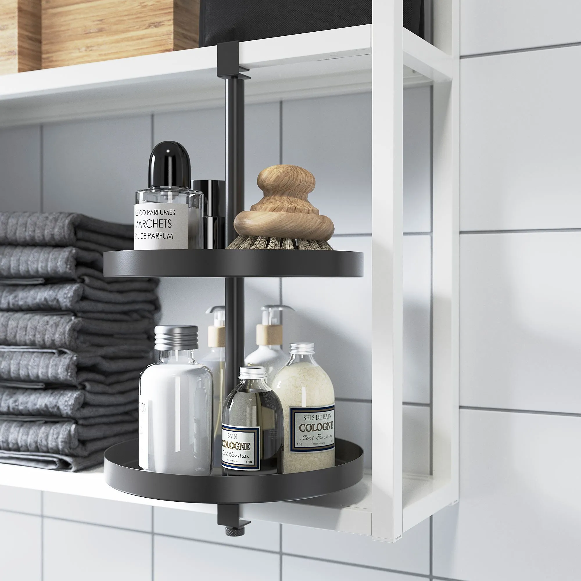 С этой вращающейся полкой в ванной комнате, стало легче хранить украшения, лак для ногтей и кремы. Может быть, у вас может быть боковина или полка?