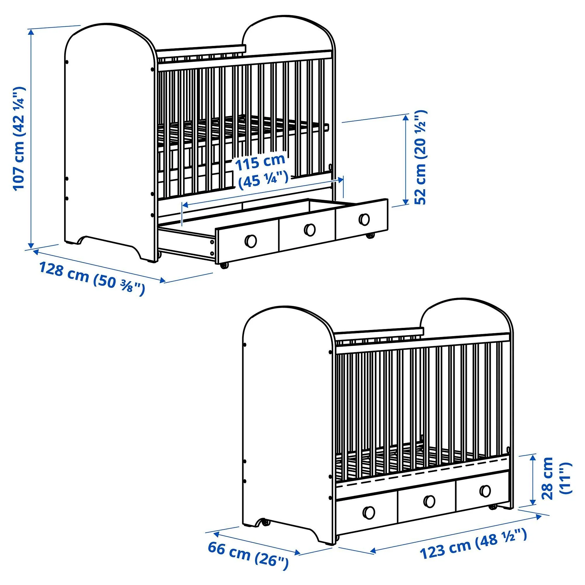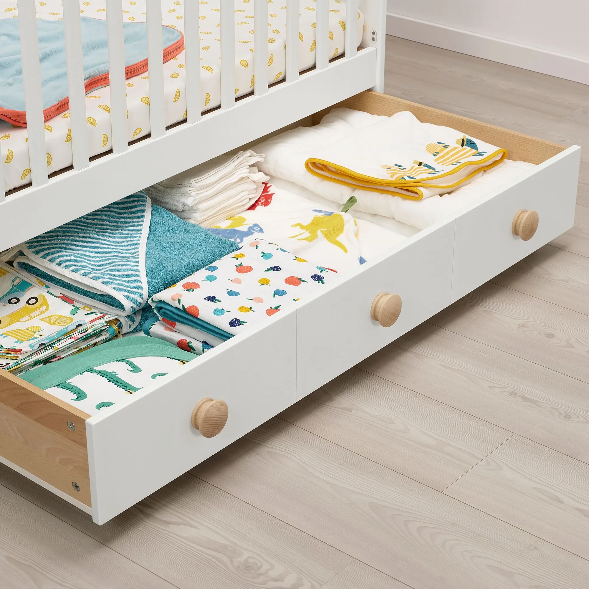 Под кроваткой находится просторный ящик для хранения вещей с направляющими для игрушек или дополнительных постельных принадлежностей, который легко выкатывать и выдвигать, а также со встроенным ограничителем, удерживающим ящик на месте.