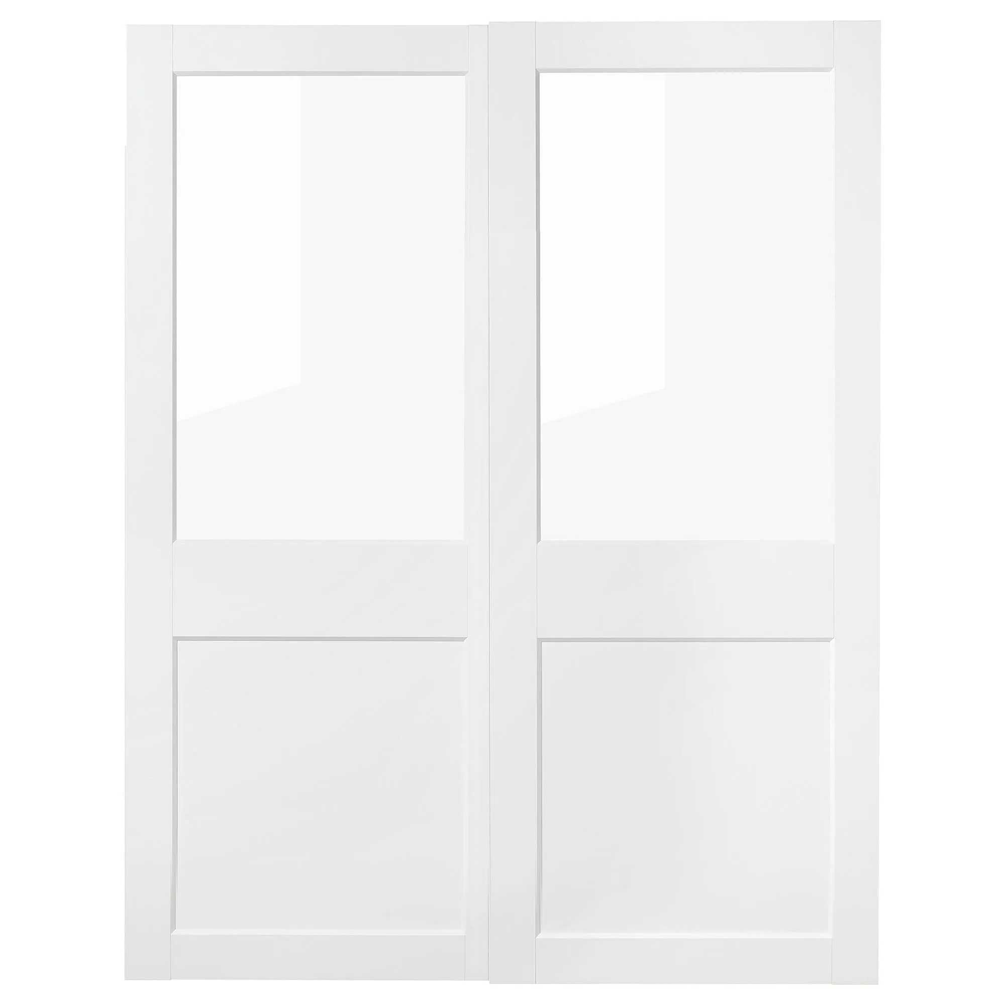 Пара раздвижных дверей GRIMO со стеклом сверху идеально подходит, если вы хотите продемонстрировать свои свежевыглаженные рубашки или яркие платья – и они сочетаются с белыми каркасами гардероба серии PAX.