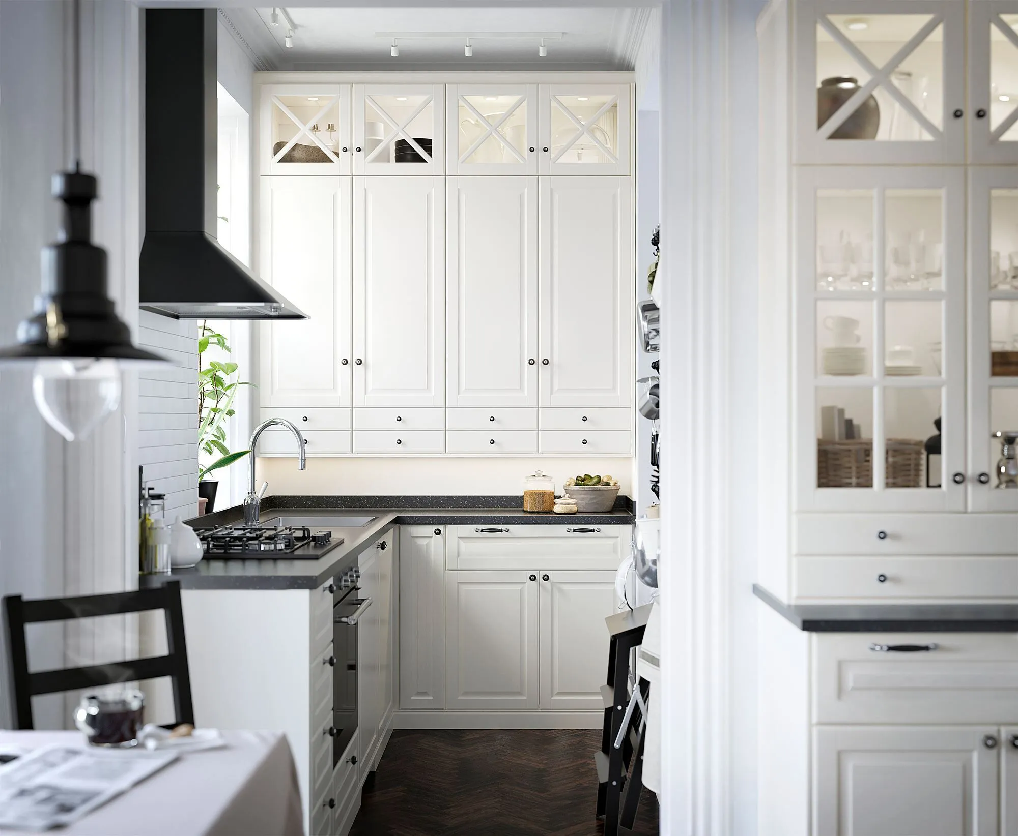 Классическое решение в кремово-белом цвете со скошенными панелями, которые создают традиционный характер и создают ощущение тепла и гостеприимства. Фасады BODBYN легко содержать в чистоте благодаря гладкой лакированной поверхности.