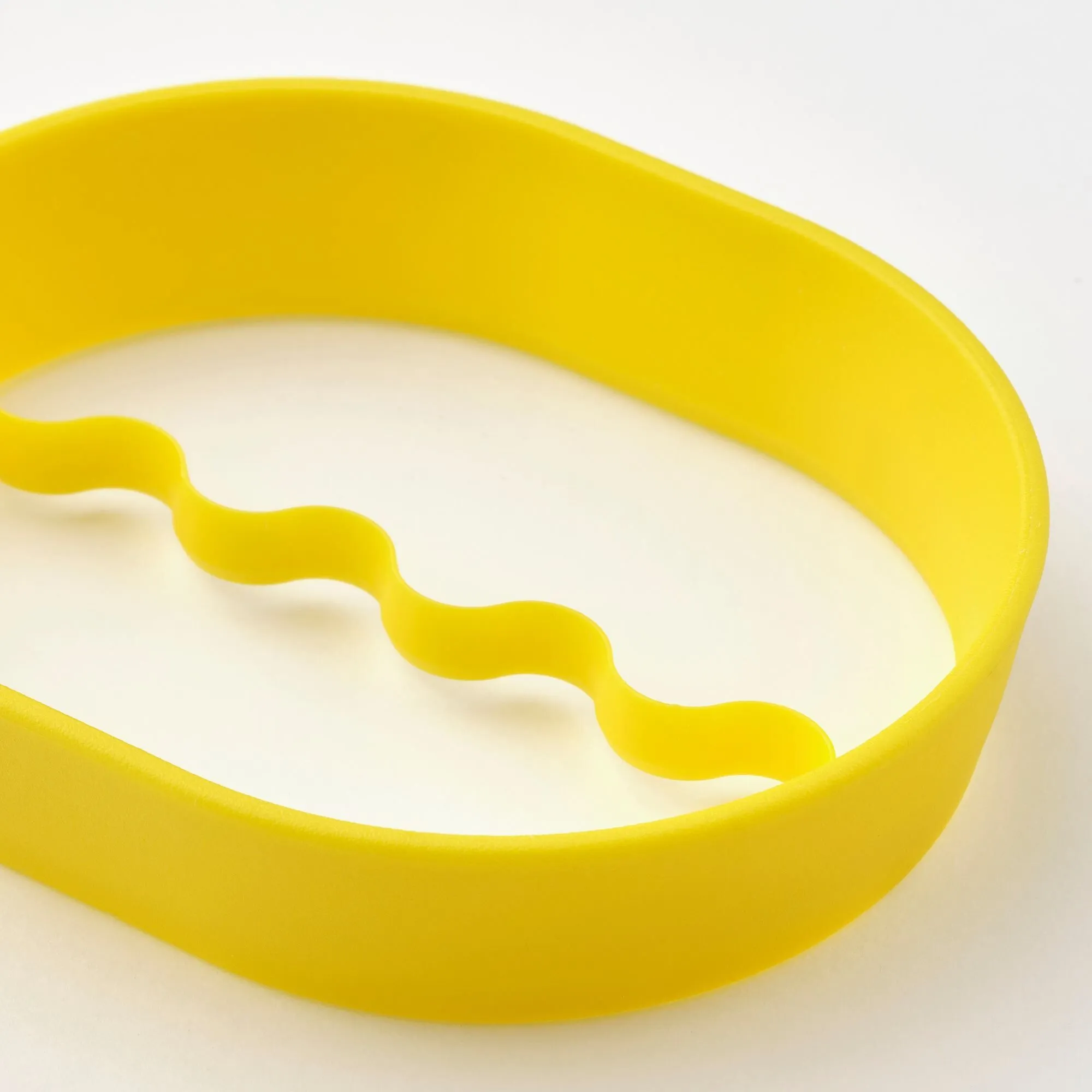 Желтый режущий инструмент идеально подходит для нарезки яиц на волнистые половинки.