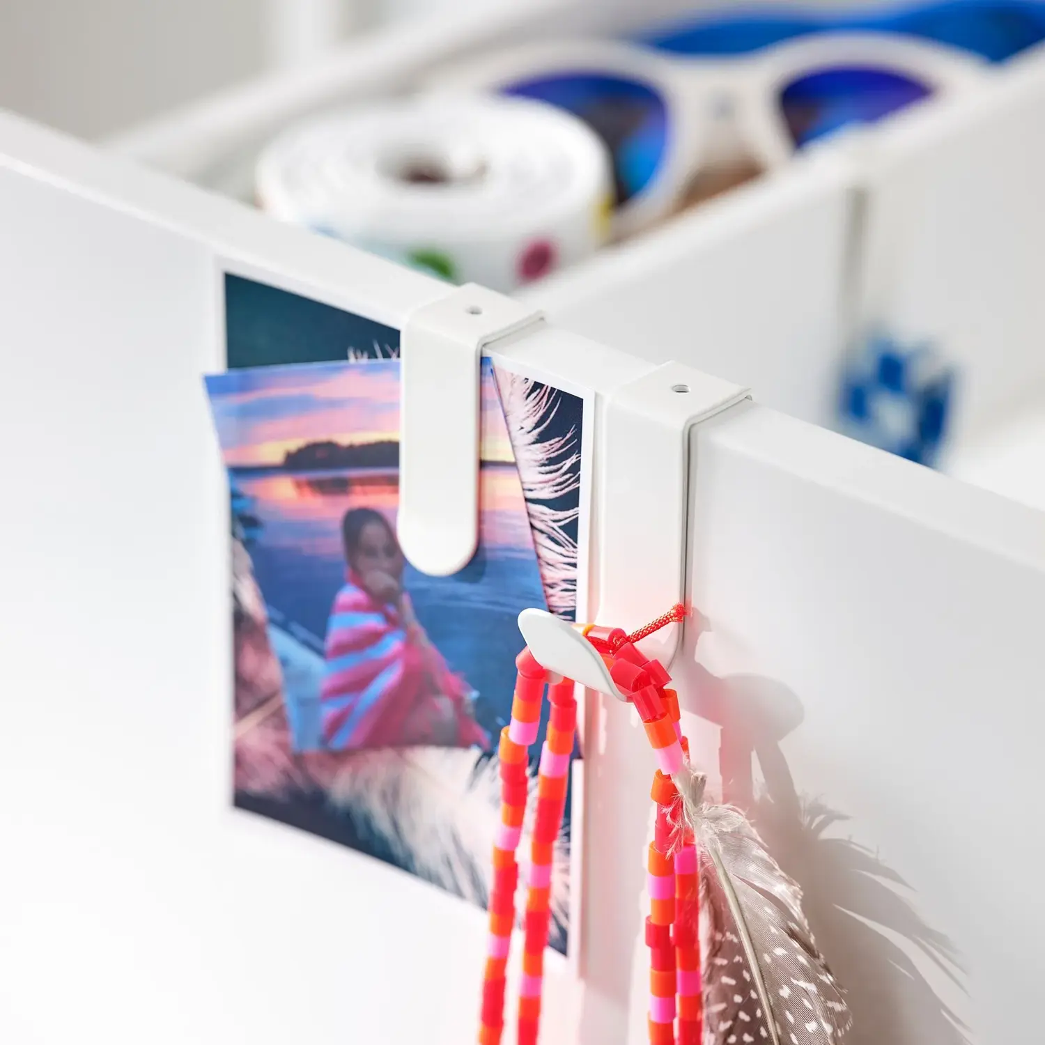 Используйте любую поверхность — этот крючок и зажим можно использовать снаружи и внутри дверей СМОСТАД, выдвижных ящиков и фасадов ящиков.