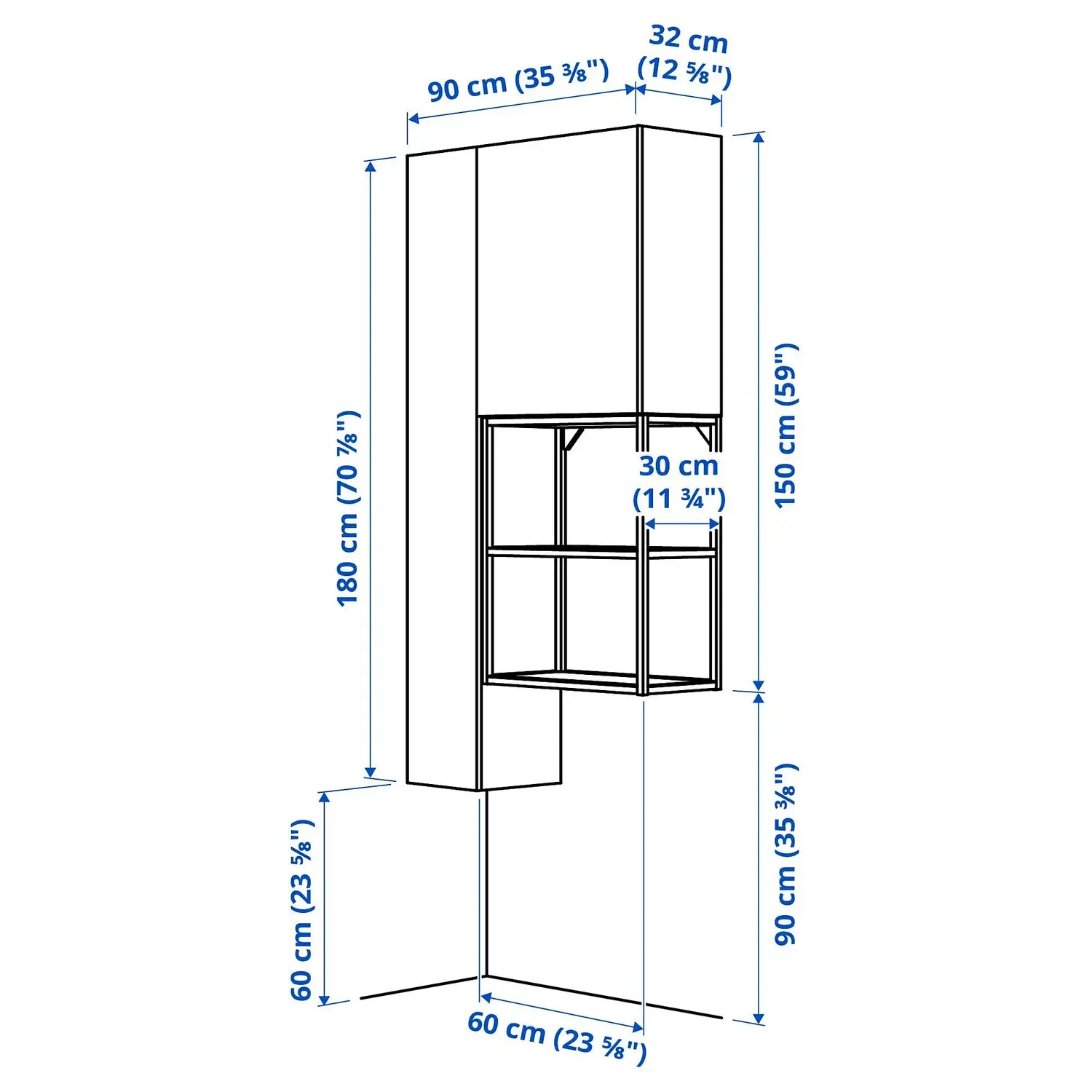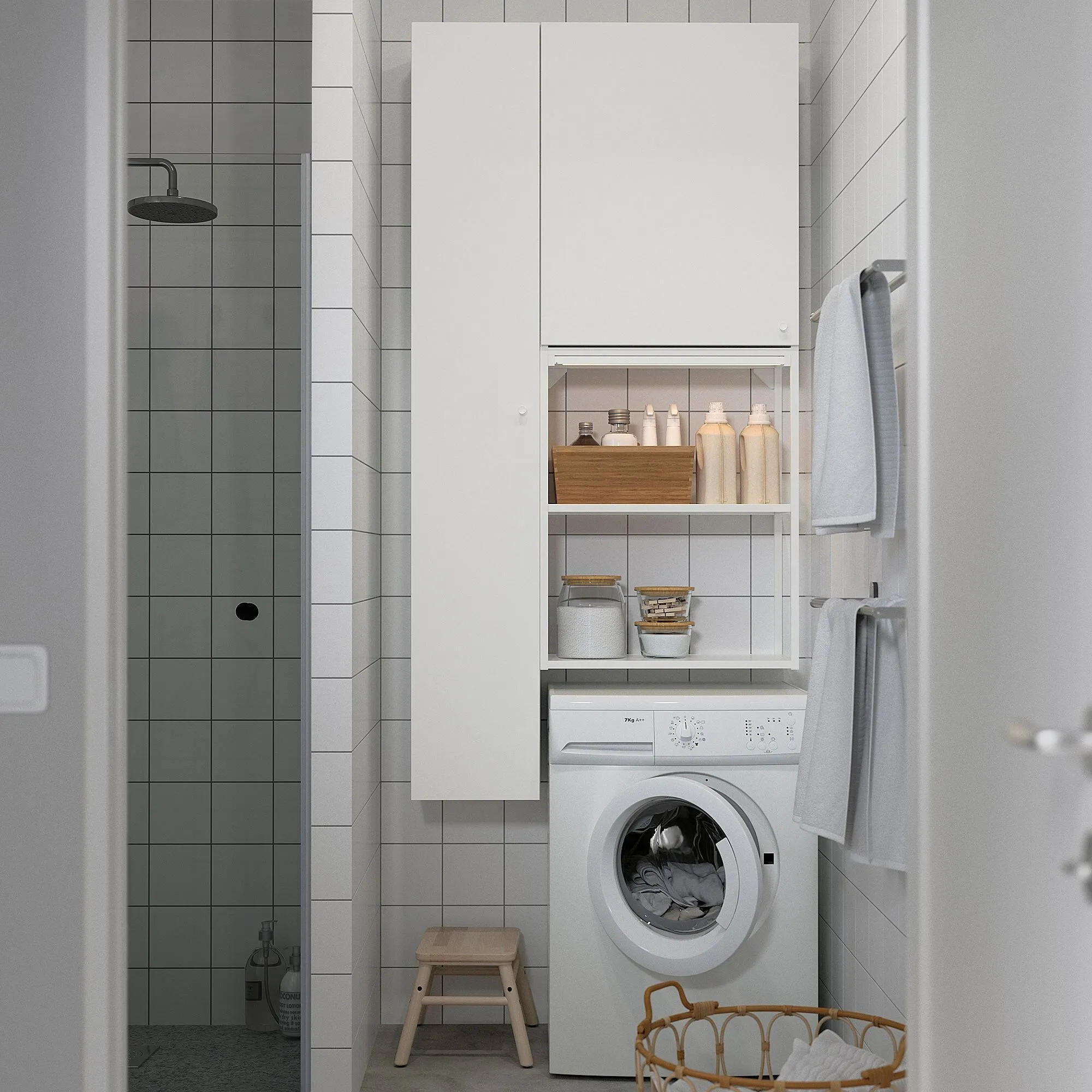 Серия ENHET позволяет легко начать все заново с новым решением для стирки. Эта комбинация предлагает идеальное сочетание открытого и закрытого хранения, а также специальное пространство для стиральной машины и корзины для белья.