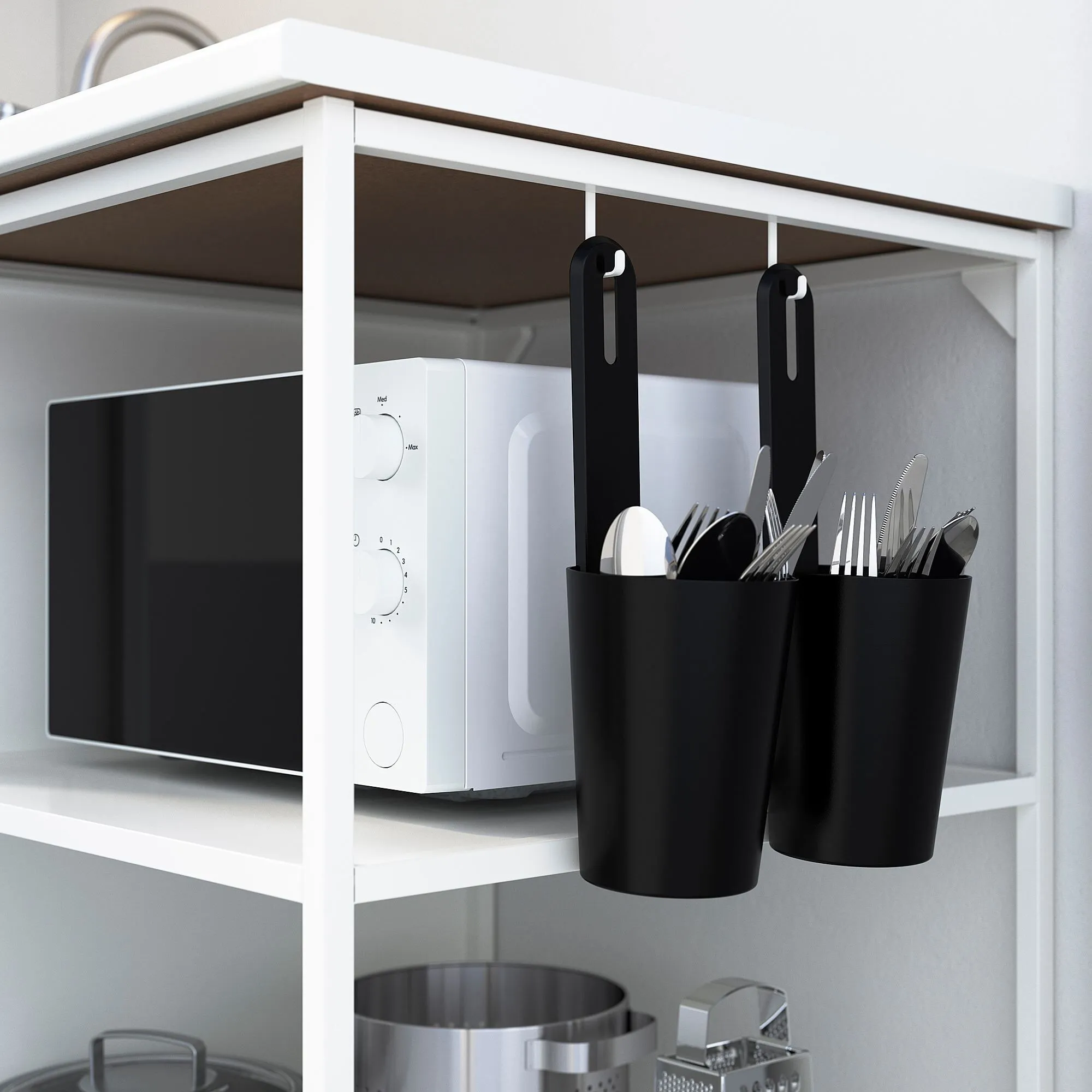 Вставьте крючки в пазы по бокам рамы, чтобы подвешивать полотенца или контейнеры. Не требуется сверление стен. Продается отдельно.