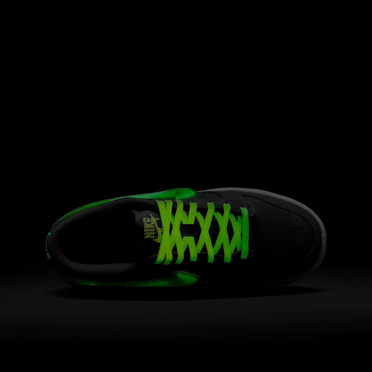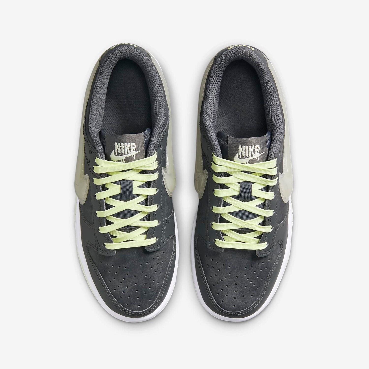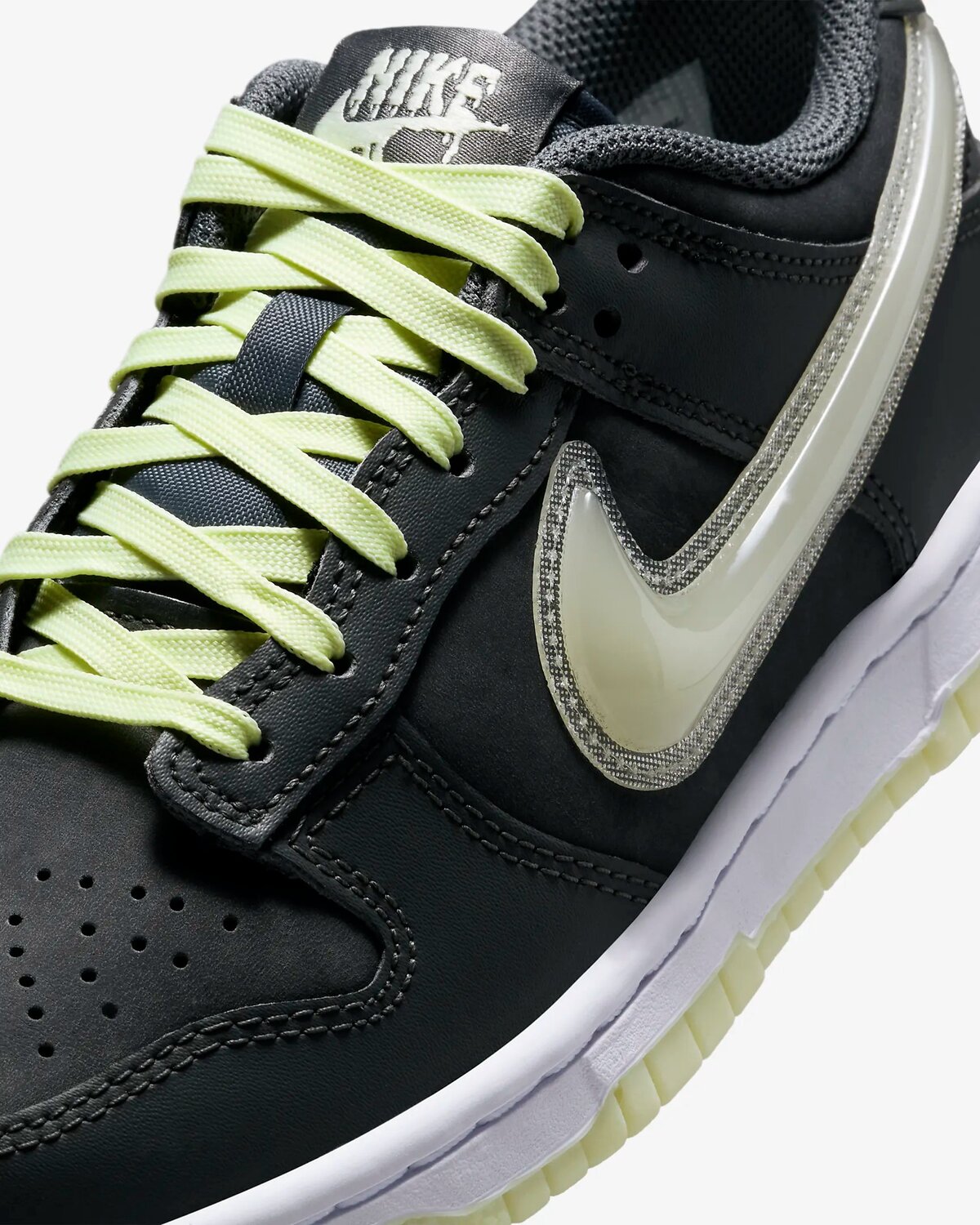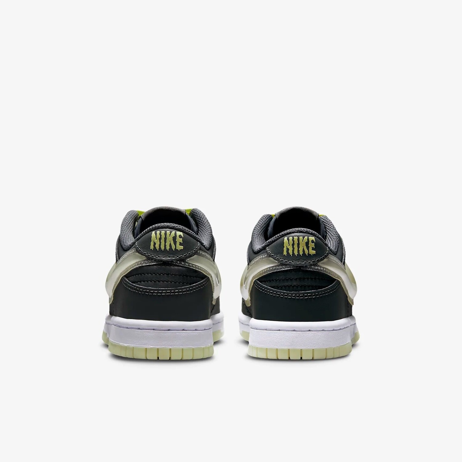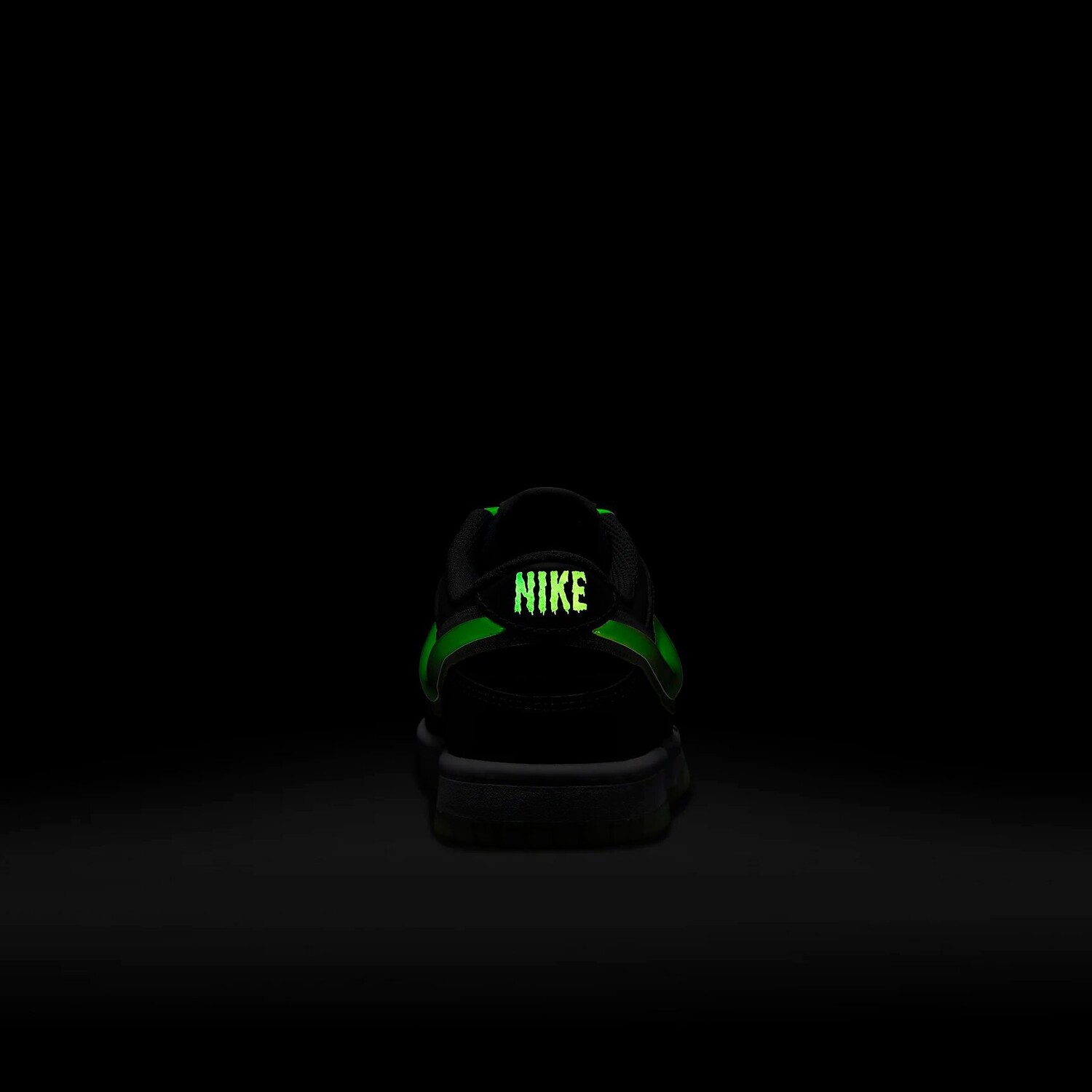 Посмотрите, что скрывается за тенью в этих темных и призрачных Dunk Lows. Прочная кожа в паре с подошвой зеленого цвета обеспечивает комфорт и сцепление с поверхностью, а светящиеся в темноте детали придают им стиль, который больше похож на угощение, чем на розыгрыш.