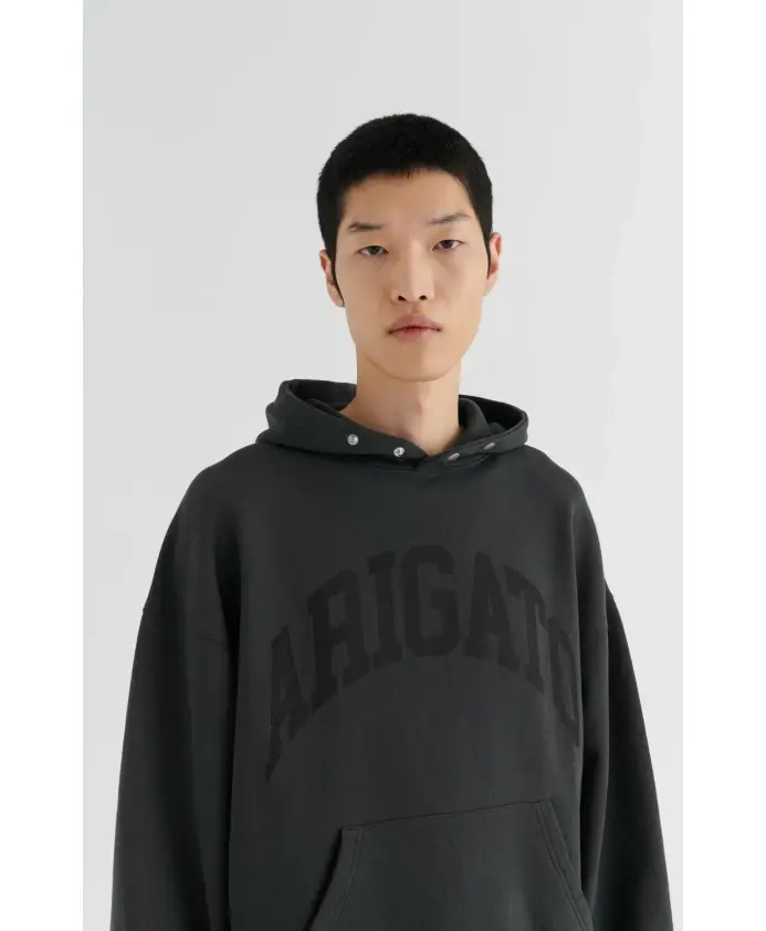 Толстовка Link изготовлена из органического хлопка и украшена изогнутым логотипом Arigato. Он оснащен фурнитурой вдоль капюшона и передним карманом. Это худи имеет объемный крой. Рост модели 188 см, размер М.