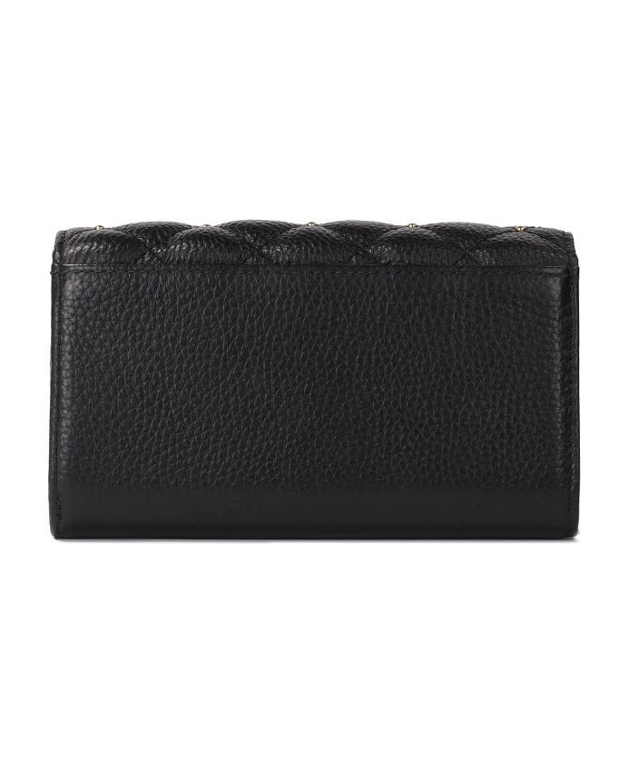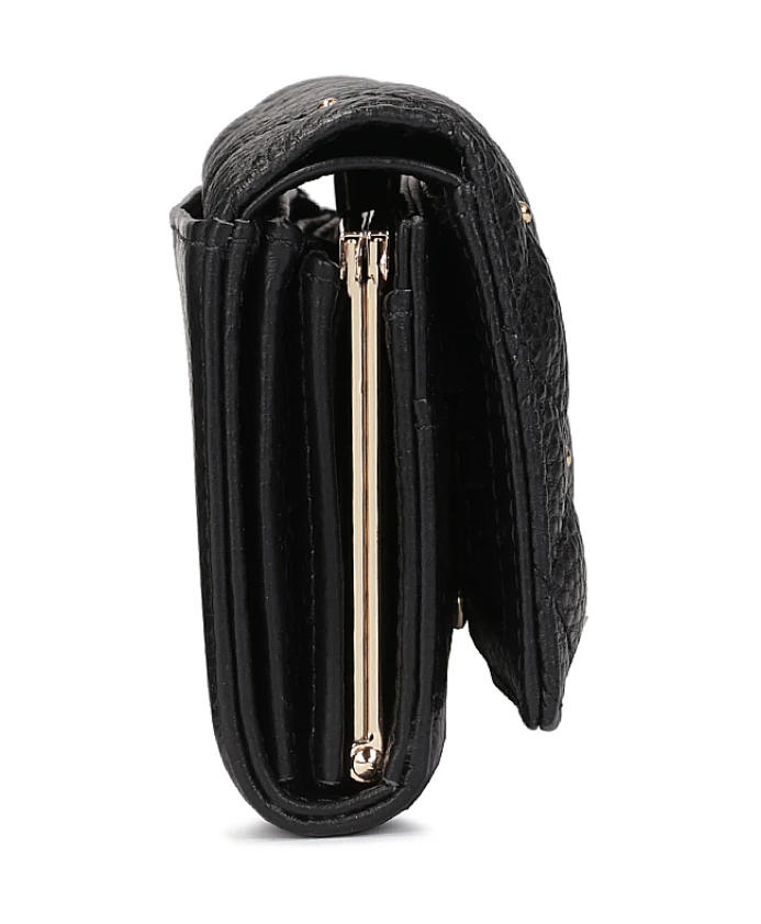 Черный кошелек из гладкой натуральной кожи – эффектный крой, который понравится любой элегантной женщине. Уникальная стеганая передняя часть придает ему стильный и неподвластный времени вид, а тщательно расположенные золотые заклепки подчеркивают его тонкий блеск и роскошь. Внутри предусмотрены карманы и отделения для легкого доступа ко всем мелочам, которые вы носите. В нем легко поместятся не только банкноты, монеты и карты, но также документы и другие мелкие предметы. Отличные материалы и безупречное качество изготовления повышают долговечность, качество и эстетическую ценность кошелька.
