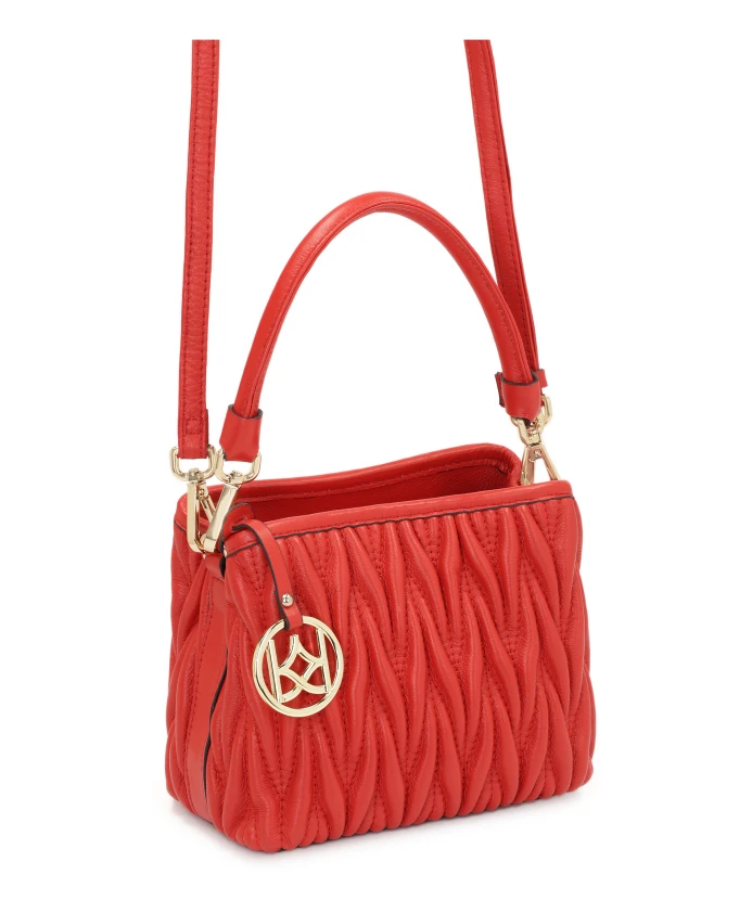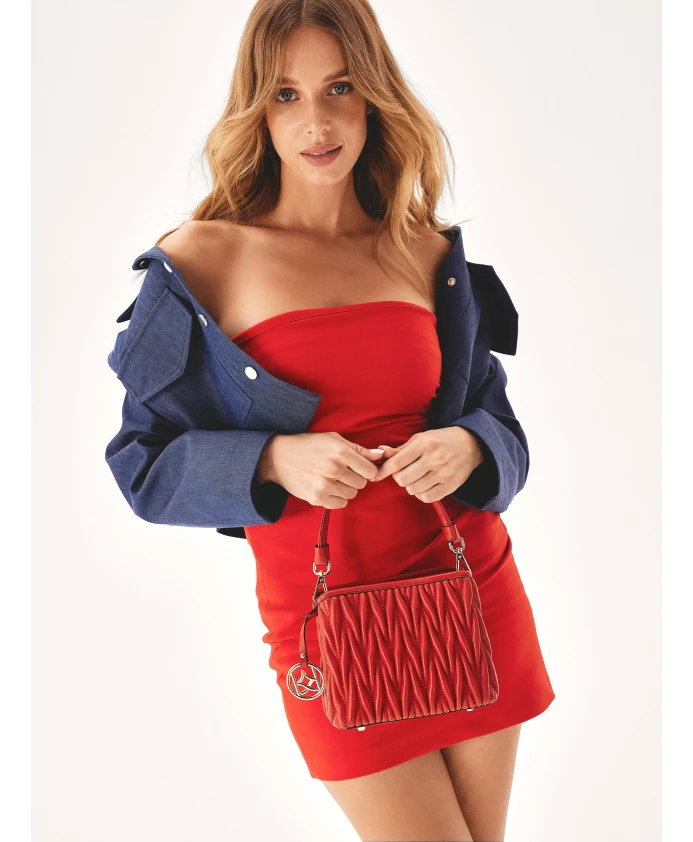 Небольшая сумочка из красной кожи с красной кожаной подкладкой впечатляет изящными складками, что придает этой модели уникальный и вневременной характер. Модный дизайн понравится любителям оригинальных аксессуаров. Модель с одной ручкой и длинным ремешком практична и универсальна. Его можно удачно сочетать с деловой, повседневной и даже праздничной одеждой. Подробности о товаре: Сумка имеет 1 основное отделение, которое закрывается на магнитную застежку. Имеет 2 отделения, 1 открытый карман и 1 карман на молнии. Он оснащен ручкой и длинным плечевым ремнем. На полу металлические ножки.