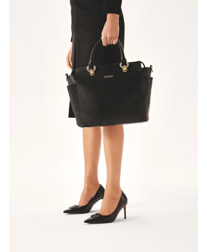 Черные туфли из высококачественной лицевой кожи придают этим туфлям исключительную долговечность и комфорт. Кожа мягкая на ощупь, плотно прилегает к ноге и отлично смотрится в течение многих сезонов. Крупная монограмма KAZAR на носу – уникальная деталь, привлекающая внимание и подчеркивающая ваш характер. Высокая шпилька олицетворяет элегантность и делает их идеальными для вечерних мероприятий, особых случаев или деловых встреч. Эта обувь подчеркивает неповторимый вкус и стиль женщины, гарантируя комфорт и уверенность. Черные туфли-лодочки KAZAR с монограммой – выбор женщин, которые ценят высокое качество и уникальный дизайн. Подкладка изготовлена из мягкой полуанилиновой козьей кожи, которая отличается отличным впитыванием влаги и обеспечивает высокий уровень комфорта. Подошва изготовлена из тунисской кожи, которая отличается прочностью и эстетичным внешним видом.