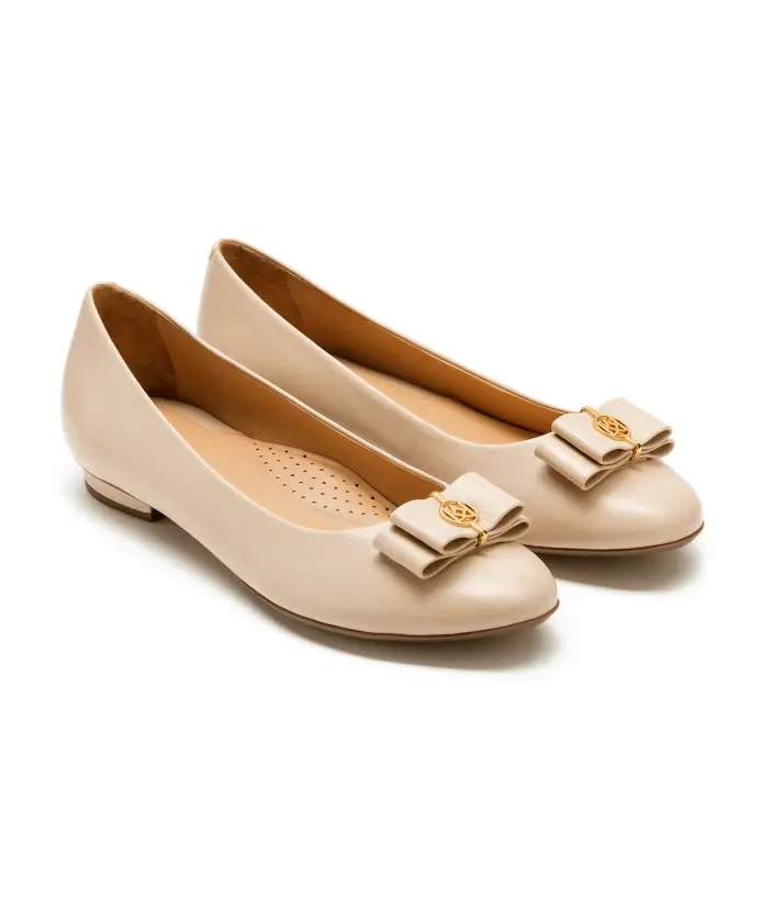 Женские балетки бежевого цвета из высококачественной кожи с верхом представляют собой классическую модель. Бантик на носочках с золотым логотипом KAZAR – нежное украшение. Стелька из козьей кожи обеспечивает комфорт при ношении.