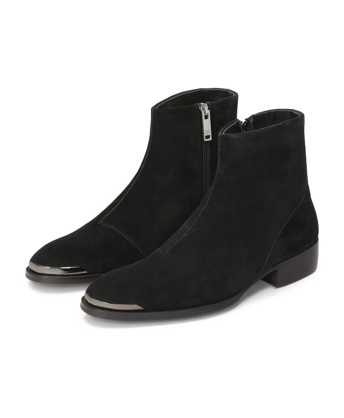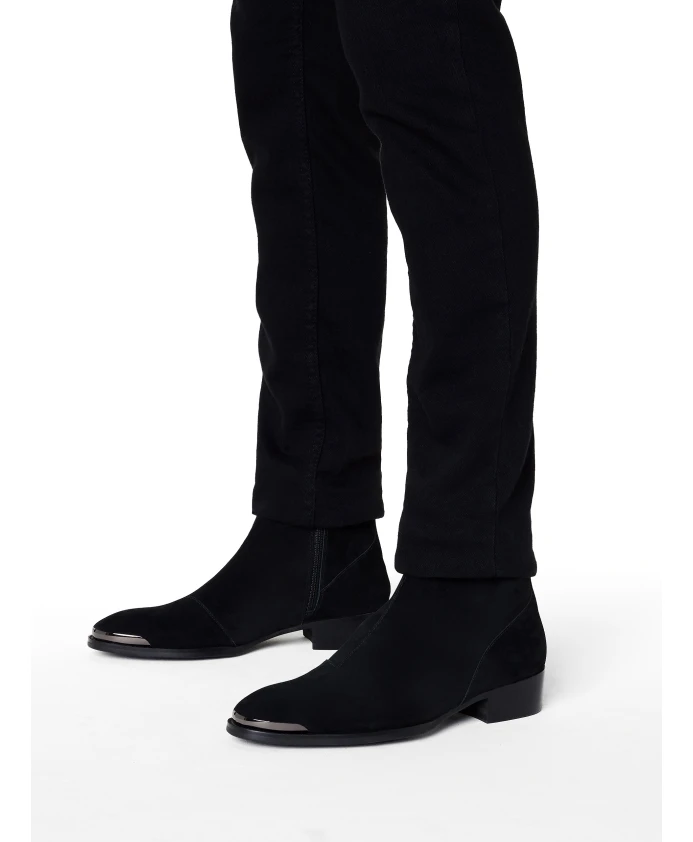Черные замшевые мужские ботинки с матовым покрытием – модель обуви, которая должна быть в гардеробе каждого стильного мужчины. Верх, доходящий до щиколотки, оснащен молнией, что позволяет легко надевать и снимать ботинки. Интересным украшением туфель является металлический орнамент на носке и невысоком каблуке. Весь внешний вид является инновационным. Сапоги станут прекрасным дополнением осеннего гардероба в сочетании с пальто и шарфом. Настоящий феномен моды!