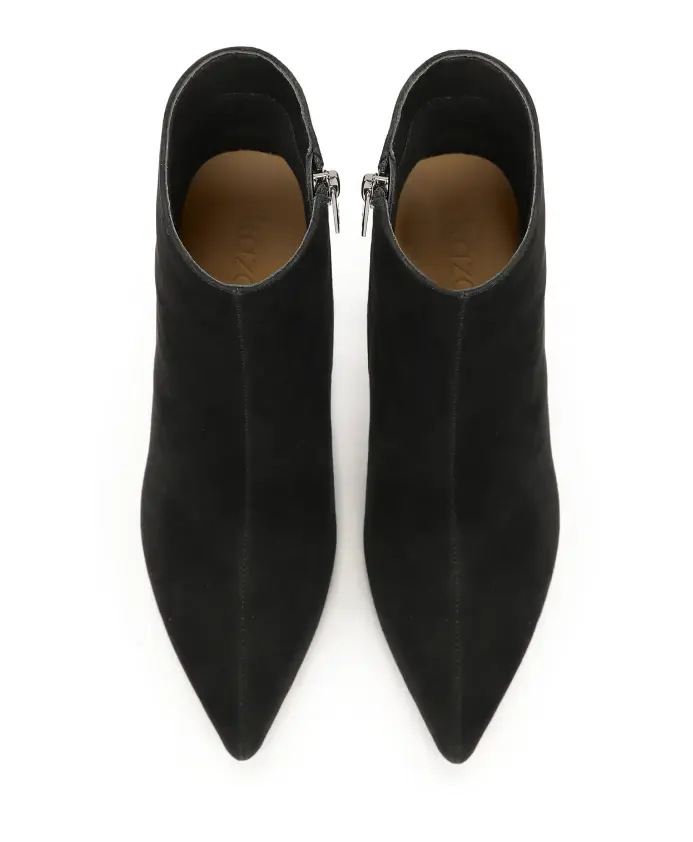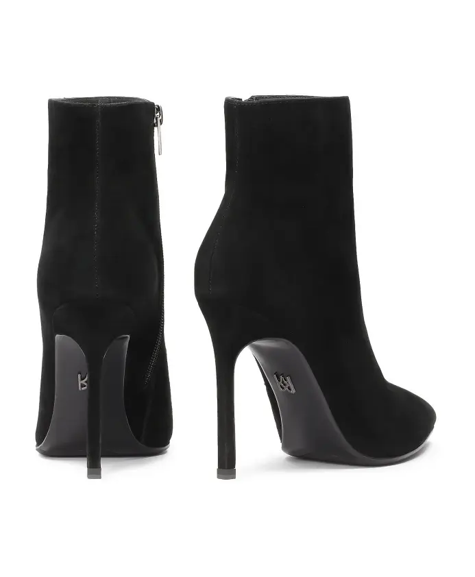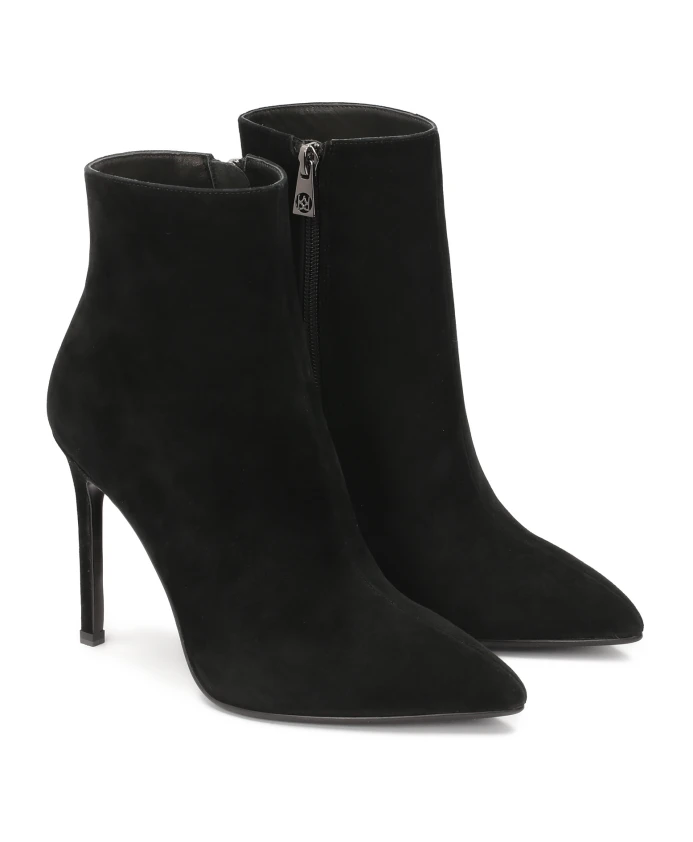 Черные ботинки на тонком каблуке с голенищем до щиколотки – интересный выбор для осенне-зимнего и весеннего сезонов. Верх из высококачественной замши имеет узкий крой, тонко подчеркивающий форму стопы. Минималистичные ботинки универсального черного цвета идеально вписываются в повседневный дресс-код. Подкладка из полуанилиновой овчины обеспечивает исключительный комфорт благодаря отличным свойствам поглощения влаги.