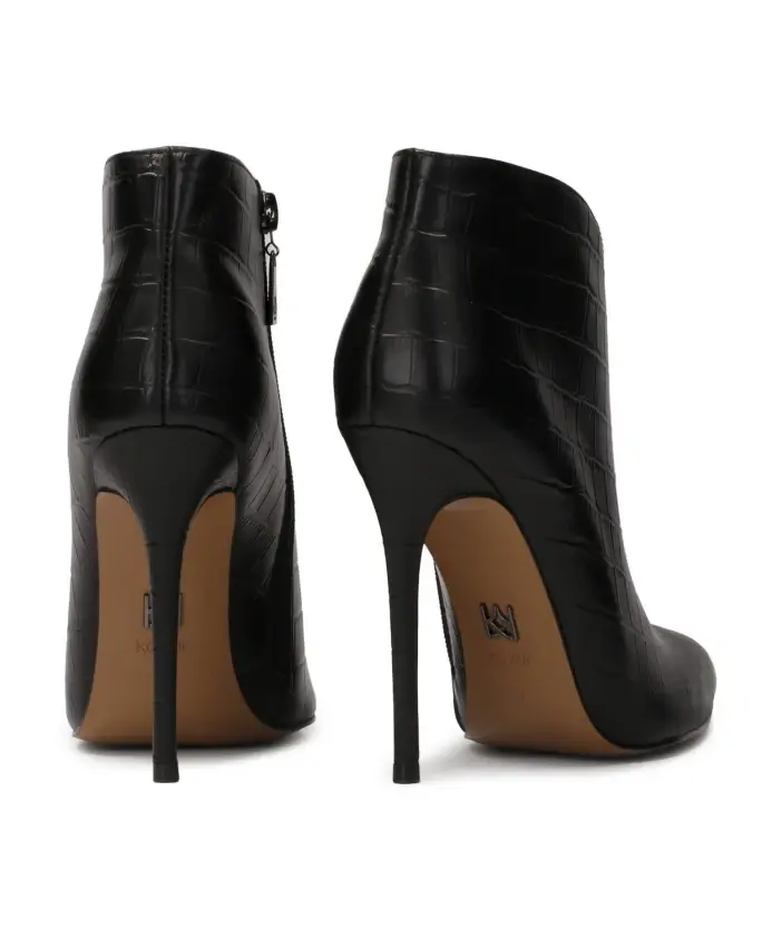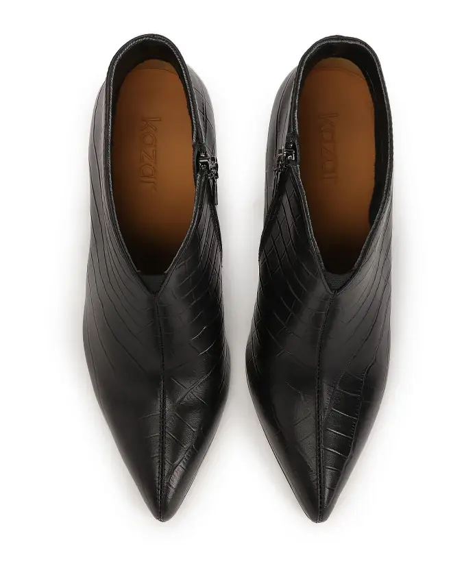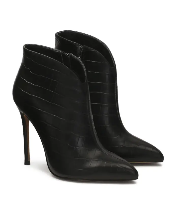 Сапоги с низким голенищем и высоким тонким каблуком – квинтэссенция элегантности и стиля. Их уникальный дизайн делает их идеальным выбором для элегантных встреч и вечерних прогулок. Изготовленные из черной тисненой кожи, они выглядят одновременно роскошно и классически. Заостренный носок добавляет тонкую нотку чувственности и подчеркивает нежность и деликатность всего тела. Боковая молния позволяет легко надевать и снимать обувь, придавая ей нотку современности и практичности. Подкладка из мягкой полуанилиновой овчины гарантирует высокий комфорт, а меховая подкладка из тонкой ткани создает ощущение тепла в холодные дни.