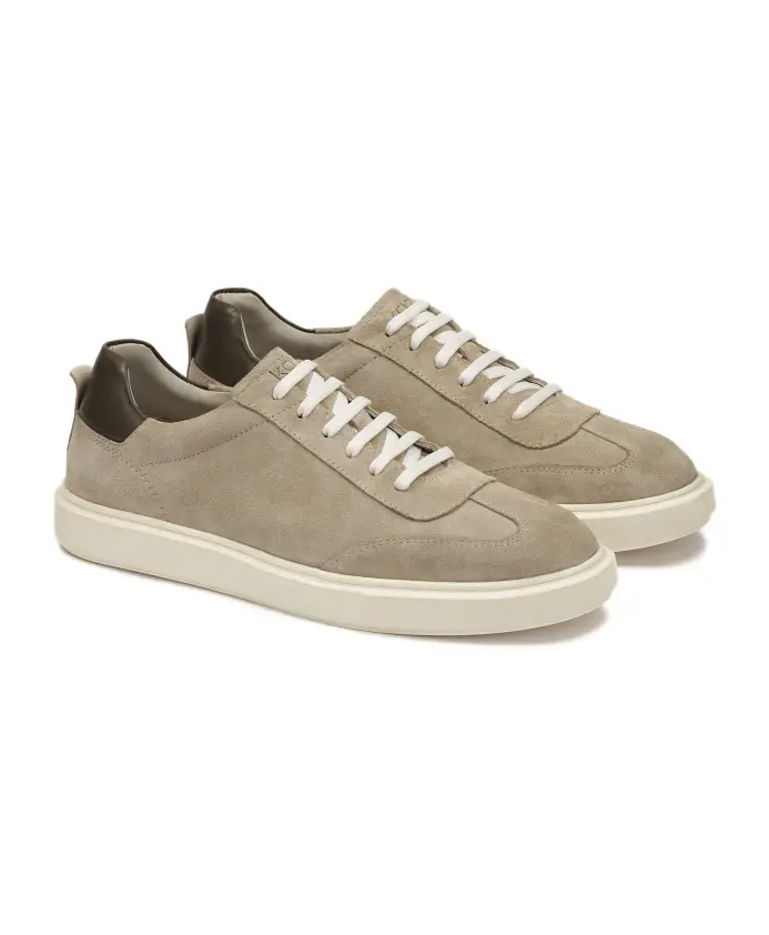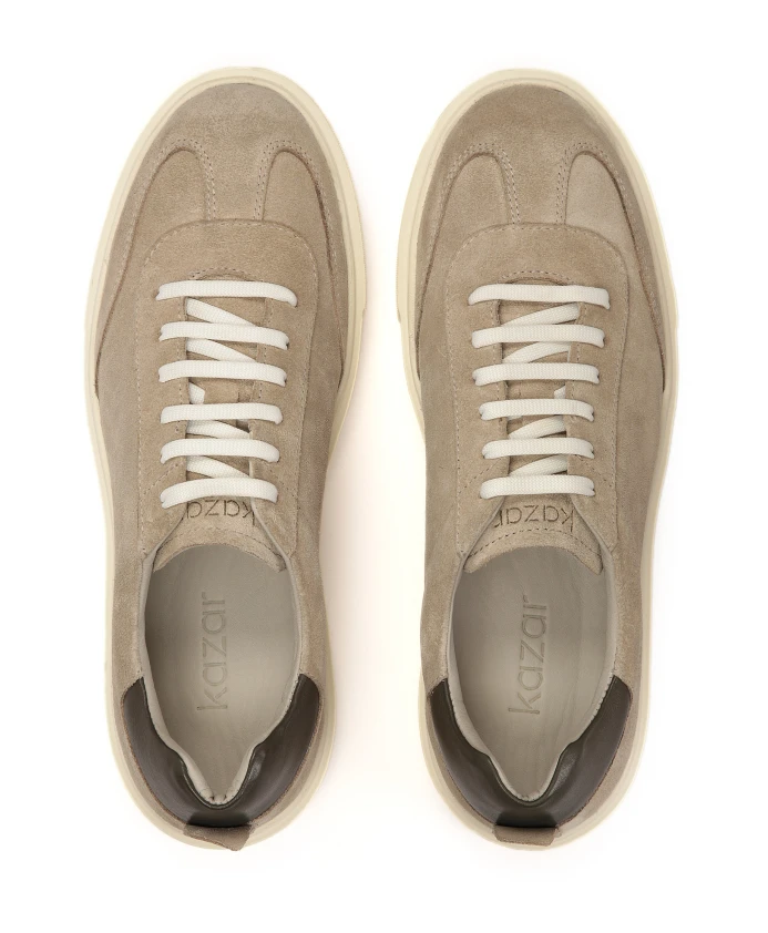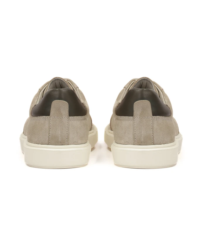 Кроссовки из серо-коричневой замши с гладкой кожаной вставкой на пятке станут прекрасным дополнением городского стиля. Туфли имеют контрастную белую подошву и шнурки, которые добавляют спортивный оттенок. Покрой материала верха напоминает классические кроссовки, что делает их очень универсальными и подходящими ко многим нарядам. Кроссовки – идеальный выбор для мужчин, которые ценят комфорт и стиль. Благодаря использованию высококачественных материалов эта обувь очень прочная и устойчивая к повреждениям. Внутренняя часть обуви, обитая мягкой овчиной, гарантирует высокий комфорт.