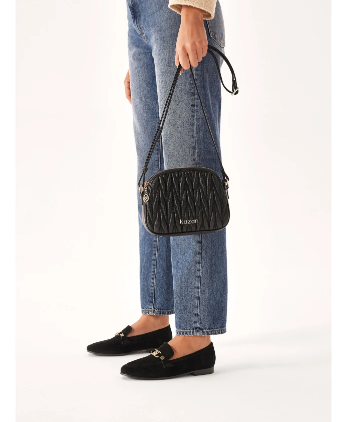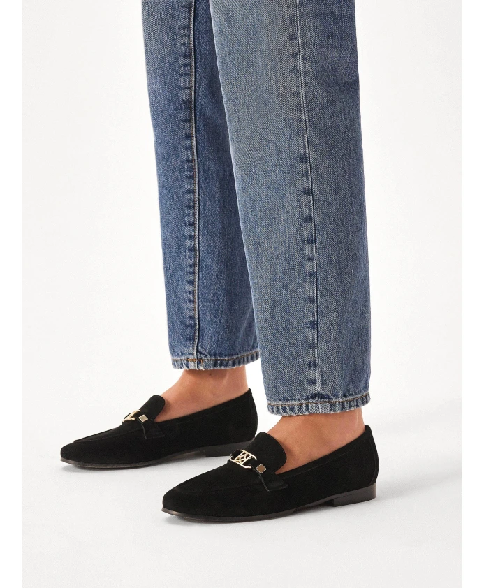 Черные ботильоны на плоской подошве – абсолютная необходимость в переходный период. Обувь изготовлена из качественной замши, приятной на ощупь. У них тонкий крой, который красиво смотрится на ноге. Вневременной стиль и универсальный черный цвет подходят к бесчисленным стилям. Все это дополняет металлический орнамент с монограммой KAZAR. Подкладка из мягкой полуанилиновой овчины гарантирует высокий комфорт.